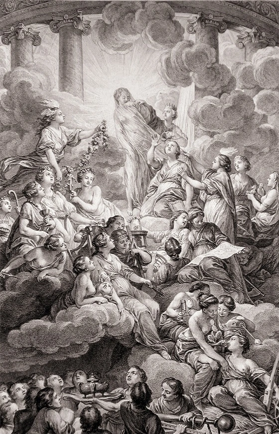진리의 신전을 배경으로 한 <백과전서>의 1권 권두화. 뮤즈들은 각각의 학문을 상징함. 이성이 진리의 뮤즈 베일을 벗기고 있음. 동시에 진리의 빛이 뻗어나가고 있음.