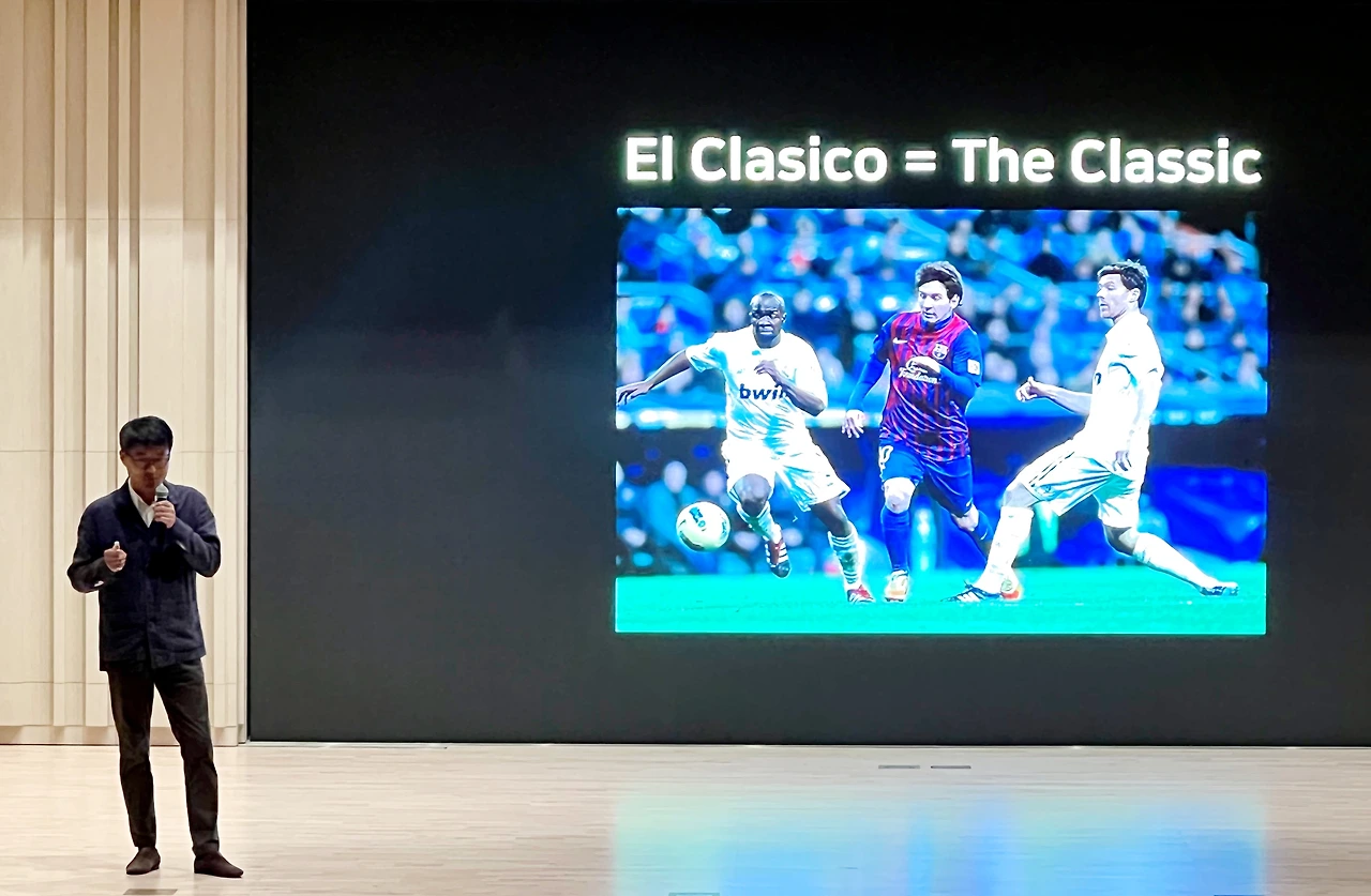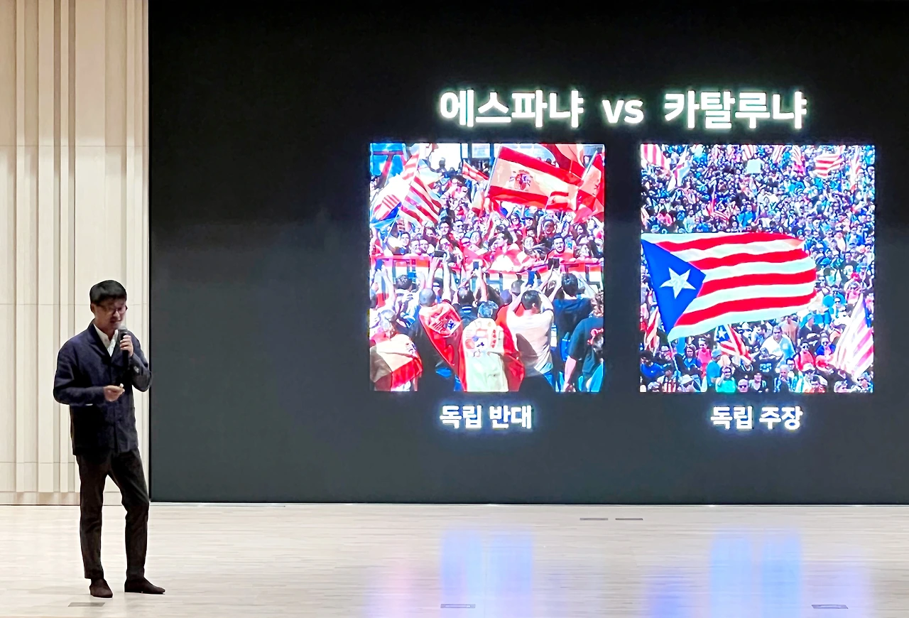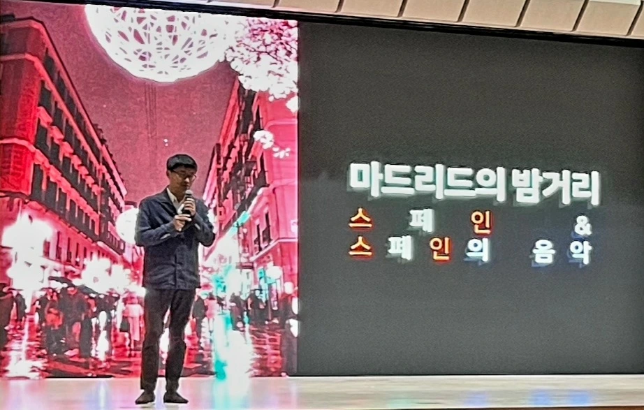 아래 보이는 사진은 어젯밤 일어난 일입니다. 축구협회 강연 아니고요. 음악회 중간을 비집고 들어간 소위 인문학 강연입니다. 프렌즈오브뮤직이란 음악 기획사가 정기적으로 진행하는 조금은 독특한 음악회입니다. 같은 주제의 음악 공연과 인문학 강연이 한 공간에서 이루어지기 때문입니다. 연주자들의 공연 장면은 촬영이 불허되어 제 손엔 넣지 못했습니다. 지난 3월에도 저는 이곳에서 <19세기 유럽 개화기의 여성 작곡가>라는 주제로 강연을 하였습니다. 어젯밤 음악회의 주제는 <마드리드의 밤거리>였습니다. 제가 최근 2회에 걸쳐 이곳에 게재했던 그 글을 강연 포맷으로 만들어 진행한 것입니다.