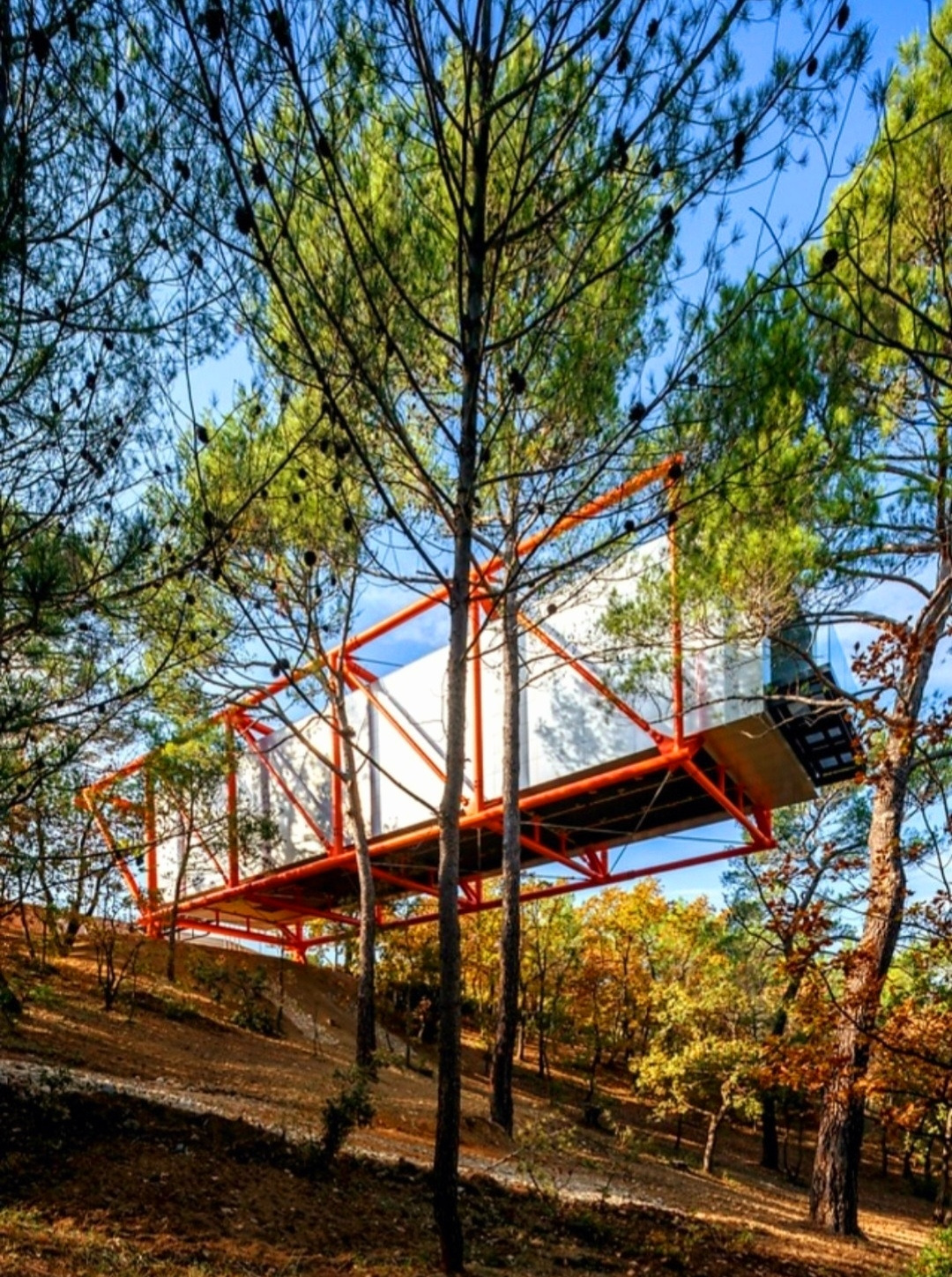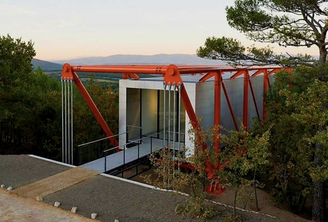 브라보! 멋진 건축물입니다. 흡사 이 모습은 과학을 비웃고 있는 듯해 보입니다. 중력의 법칙을 발견한 뉴튼이 보면 기가 막혀할 것입니다. 건물에 최면을 건 것도 아닐 텐데 하늘에 건물이 떠있습니다. 과학을 비웃는 듯해 보인다 했지만 과학의 발달로 이런 건축물이 가능했을 것입니다. 건물의 아래 4각 중 땅에 닿은 부분은 2각에 불과합니다. 땅에 강력한 지지 핀을 박았겠지요. 그래도 그런 상태론 평평하게 띄울 수 없으니 대신 그 위쪽 지붕으로 꺾이는 부분을 케이블로 잡아당겨 땅에다 박았을 것입니다. 그래서 비탈이지만 건물은 수평을 유지할 수 있게 되었습니다. 마치 남해대교와 같은 현수교 건축 시 하단의 교각 부재로 지지력을 잃은 다리 상판을 철탑 위 케이블이 당겨서 고정시키듯이 그런 첨단 건축 기법을 일반 건축물에 적용한 것이겠지요. 그래도 이런 발상과 그 결과물이 놀랍습니다. 아름다운 예술품으로 탄생했고 사람들에게 볼 것을 제공해주고 있습니다. 과연 건축은 계속해서 진화하는 위대한 아트입니다.
