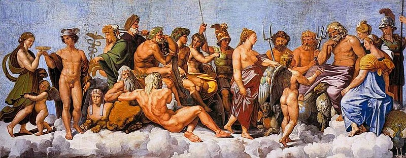 '신들의 회의', 라파엘로, 1518. 주신인 제우스는 오른편 끝에서 네 번째