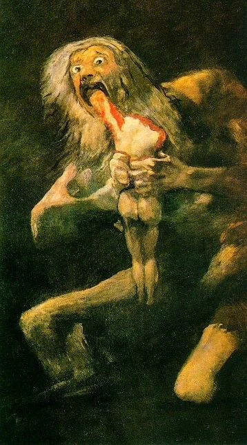 크로노스는 그리스 신화의 2대 주신입니다. 여기서 주신은 디오니소스와 같은 술의 신을 말함이 아니라 신들의 신, 신들의 왕을 이릅니다. 그가 이 그림에서 아들을 잡아먹고 있는 이유는 그 아들이 아버지인 그를 죽이고 왕좌를 차지할 것이라는 예언에 기초하여 애당초 화근을 없애기 위해 이렇게 무서운 행동을 하고 있는 것이었습니다. 즉 권력에 눈이 멀어 자식들을 없애고 있는 것입니다. 그렇게 그는 아내인 레아가 자식을 낳는 족족 잡아먹어 6명의 형제를 잡아먹었습니다. 하지만 그가 마지막으로 잡아먹고 안심한 그 6번째 아들은 그 꼴을 더 이상 볼 수 없었던 레아의 기지로 먹게 된 강보에 싼 따뜻한 돌덩이였습니다.