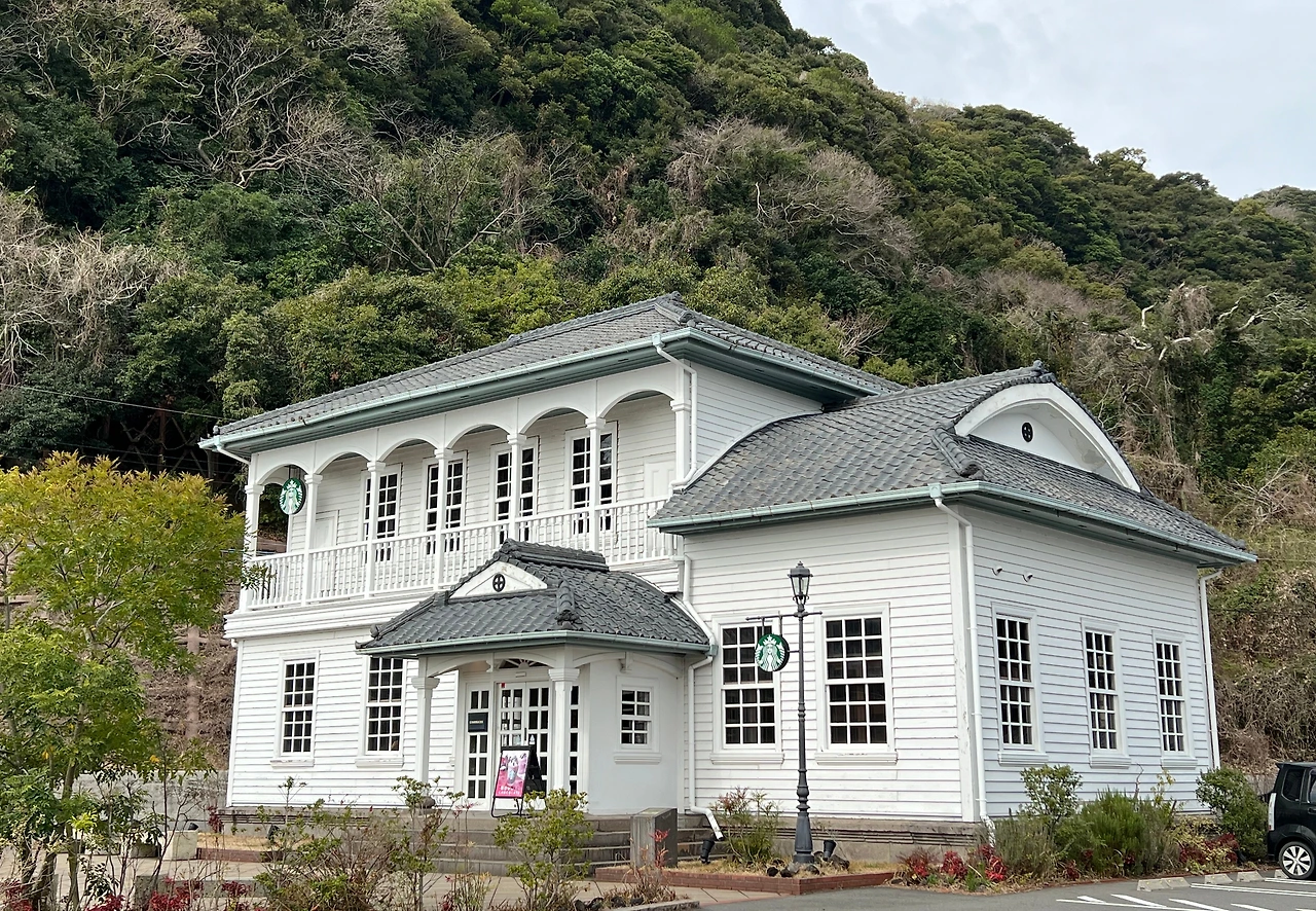 일본 최초 산업화 단지인 쇼코슈세이칸 내 서양식 주택에 입점한 스타벅스. 현관 상단 표식은 시마즈 가문의 문장