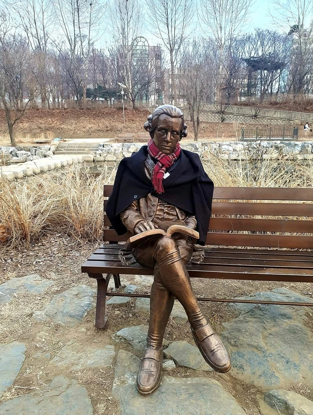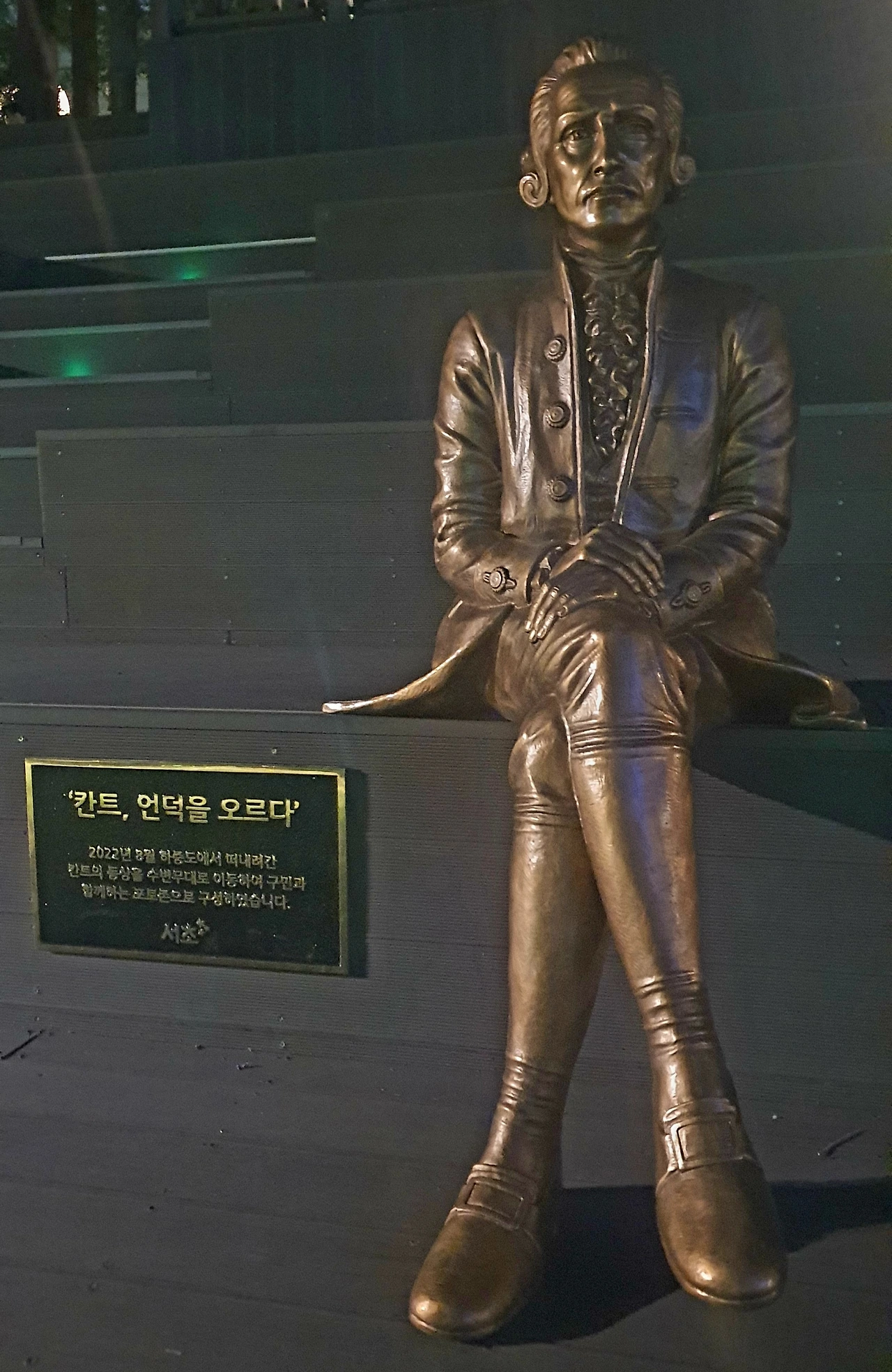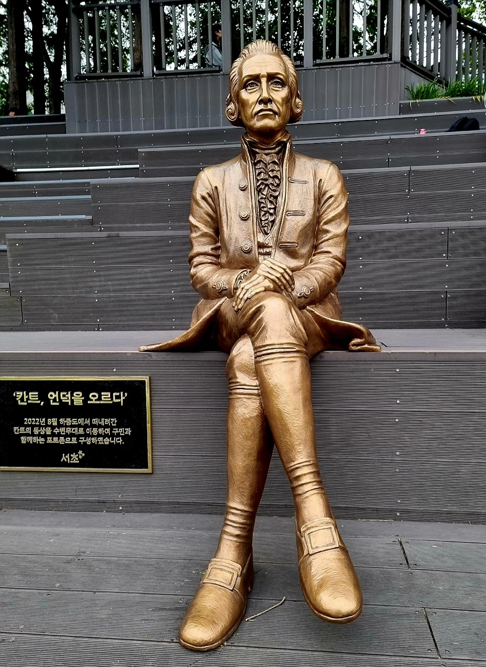 이제 높은 곳에 위치한 칸트는 양재천을 산보하며 오가는 수많은 주민들을 다 볼 수 있게 되었습니다. 주민들 또한 과거처럼 칸트를 보기 위해 일부러 칸트가 있었던 천 안 미니 중도로 걸음을 틀지 않아도 산보 중 자연스레 그를 볼 수 있게 되었습니다. 그와 함께 사진도 양 옆에 앉아서 여럿이서 찍을 수 있게 되었으니 그만큼 그는 주민들과 더 가까워졌습니다.