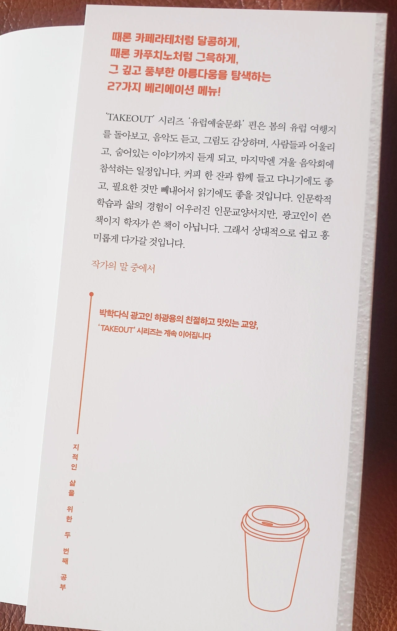 오늘 책이 나왔습니다. 2년 전 펴낸 첫 책보다 덜 부끄러워 보이는 책입니다. 아무래도 출간 학년이 올라가다 보니 들어간 내용도 그렇지만 앞뒤 외모도 세련되어져 밖에 들고 다니기에도, 실내 장식용으로도 손색이 없어 보입니다. 그리고 그때보다 두 배 가까이 늘어난 페이지로 가성비도 좋아졌습니다. 한마디로 여러모로 업그레이드되었습니다. 이 책이 순조롭다면 같은 아이덴티티의 '테이크아웃 시리즈'로 이어질 예정입니다.