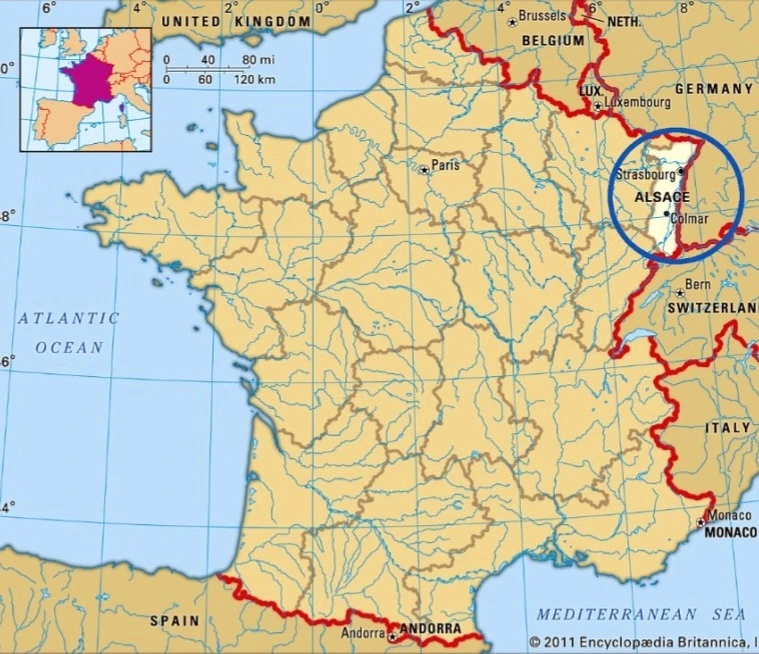역사적으로 주인이 계속해서 바뀐 프랑스와 독일의 접경 지역 알자스. 로렌은 알자스 바로 좌측 지역 (출처, 브리태니커백과사전 2011)