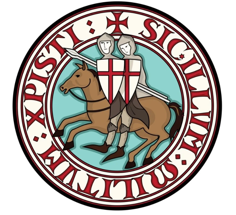 템플 기사단의 십자가 표식(상)과 인장(하). 형제애를 강조한 이 인장은 후에 종교 재판에서 동성애 코드로 누명을 씀
