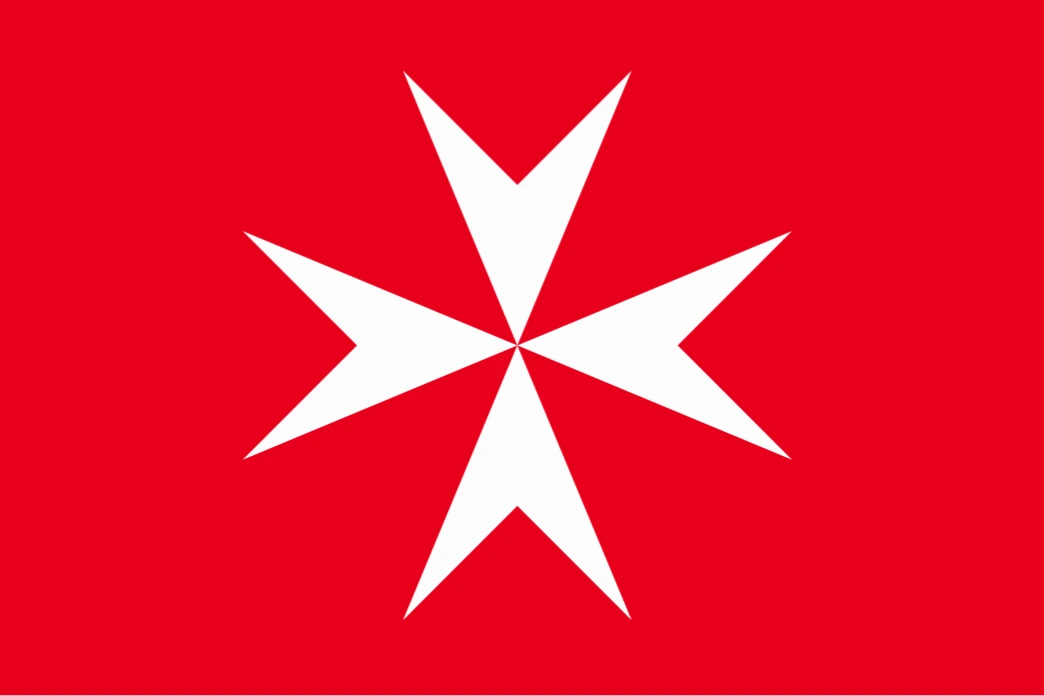 몰타 기사단의 국기(상)와 그들을 상징하는 표식인 몰타 십자가(하)