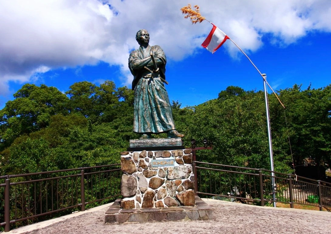 나가사키 가자가시라 공원에 있는 사카모토 료마의 동상. 그 옆 깃발은 그가 설립한 해원대의 표식 (출처, 나가사키현 관광 홈페이지)