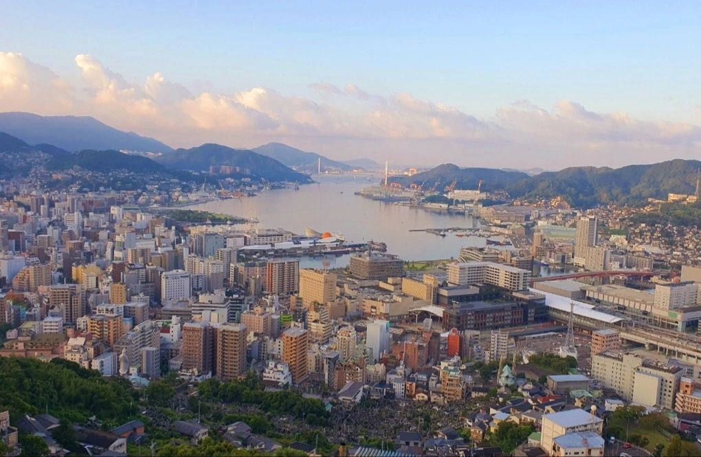 구라바엔 언덕에서 바라본 아름다운 항구 나가사키 전경. 우측 위로 미쓰비시 중공업이 보임