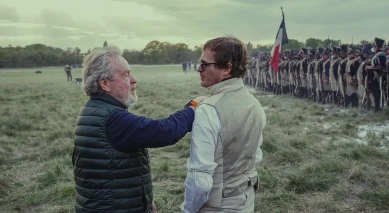워털루 전투 촬영을 위해 호아킨 피닉스에게 나폴레옹의 연기를 지도하고 있는 리들리 스콧 감독