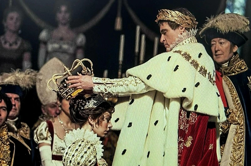 영화에서 나폴레옹은 20대 청년 시절부터 전혀 그런 멋진 청년의 모습으로 나오지 않습니다. 역사 왜곡 논란이 있는 1793년 마리 앙투와네트의 단두대 처형식부터 그의 모습이 나오는데 당시 그는 24세의 청년이었습니다. 그때부터 그는 나이 들고 뚱뚱한 모습으로 나오는 것입니다. 현재 우리가 알고 있는 배우 호아킨 피닉스의 모습으로 나옵니다. CG 등을 통해 요즘은 젊게 보이는 연출이 가능한데 <나폴레옹>에서 나폴레옹은 그렇게 하지 않았습니다. 그런 그의 모습은 영화 끝 그가 세인트 헬레나 섬에서 죽는 52세까지 거의 같은 모습으로 나옵니다. 연정이든 치정이든 남녀 관계를 강조한 영화라면 6세 연상의 조세핀과 27세에 결혼하는 젊고 패기에 찬 아름다운 새신랑인 나폴레옹이 나와야 하는데 그렇지 않아 처음부터 몰입감이 떨어진다는 것입니다. 게다가 역사적인 근거 없이 조세핀이 바람피운다고 그 먼 이집트 원정에서 급거 귀국하는 등 정세 판단력도 흐리게 나오니 과연 영웅을 소재로 한 영화에서 그렇게 나폴레옹을 코믹하게 처리한 감독의 의도가 무엇인지 궁금하게 합니다.