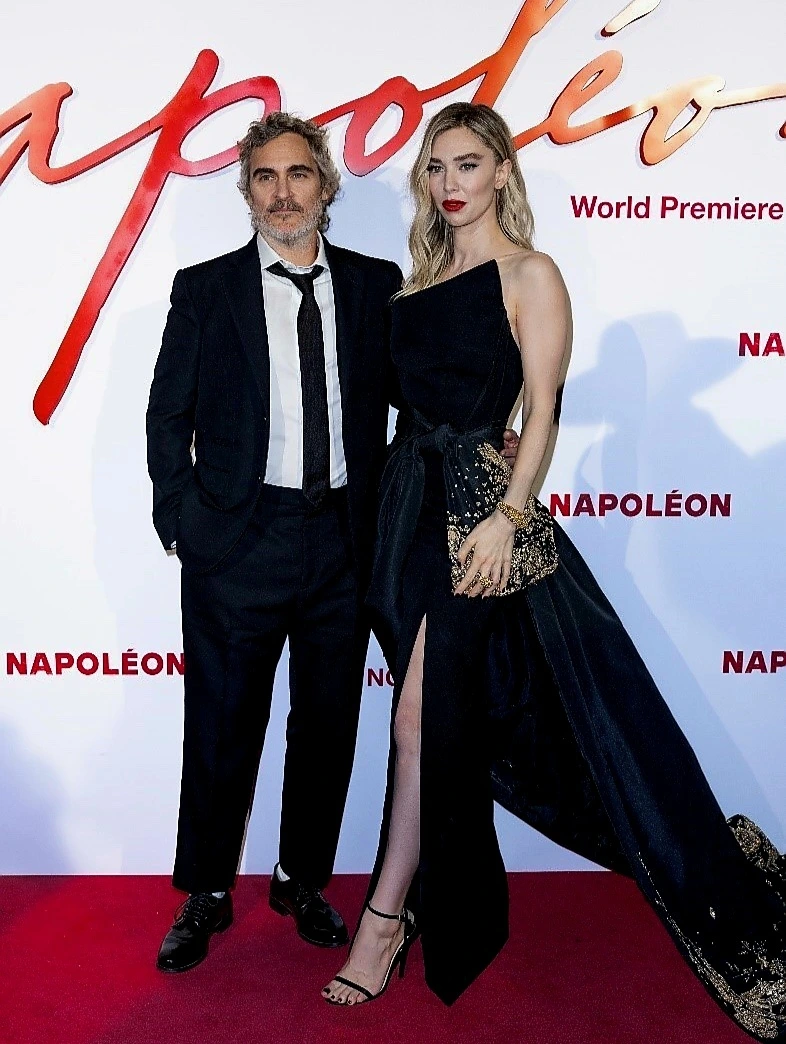 시사회의 레드 카펫 위에 선 영화 <나폴레옹>의 호아킨 피닉스(나폴레옹)와 바네사 커비(조세핀)