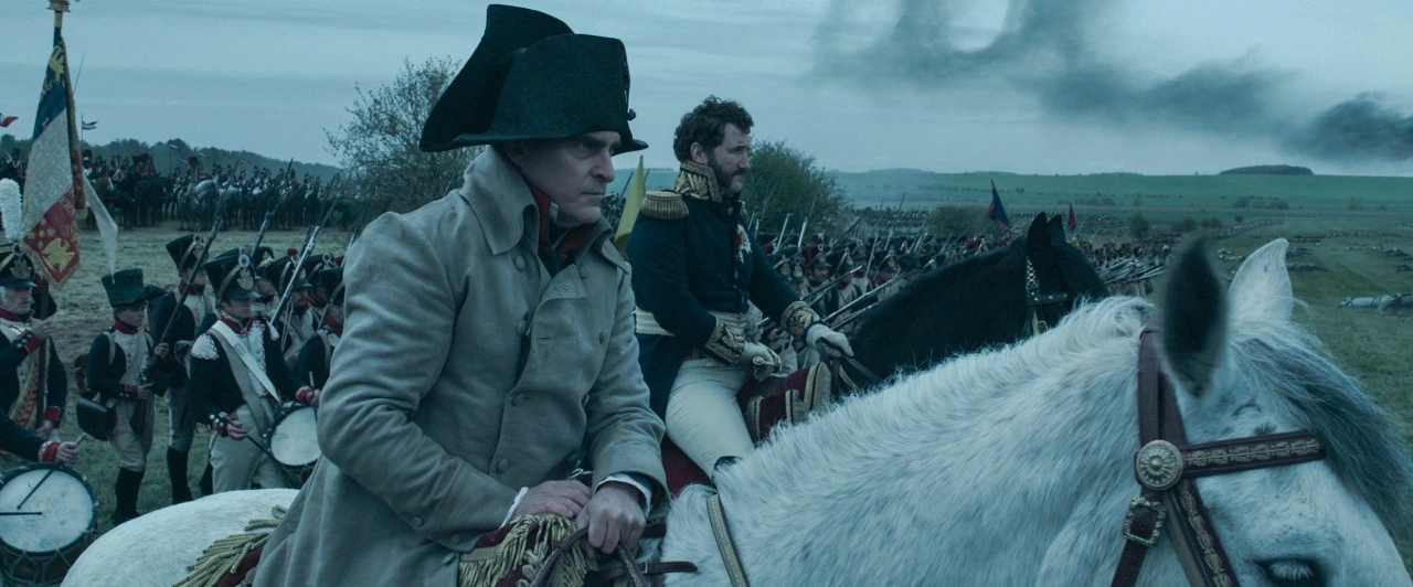 두 번째로 모자란다는 것은 영화적인 맥락입니다. 영화는 158분 내내 전쟁-조세핀-전쟁-조세핀-전쟁.. 순으로 진행됩니다. 전쟁은 정확히는 나폴레옹이 평생 치른 수많은 전투를 가리킵니다. 툴롱 전투, 왕당파 시위(방데미에르 반란) 진압, 이집트 원정, 아우스터리츠 전투, 모스크바 원정, 워털루 전투 등 영화에선 이렇게 군인들이 다수 출연하는 전투 신이 등장합니다. 저는 전투만 떼어놓고 보면 <나폴레옹>은 최고의 영화라고 생각됩니다. 과연 전작인 <글래디에이터> 초반부에서 보여준 명장 리들리 스콧 감독의 그 화려하고 생생했던 전투 장면이 부럽지 않은 대단한 전투 신들이 등장합니다. 물론 그 전투를 지휘하는 나폴레옹도 매우 멋지게 등장합니다. 조세핀 앞의 그와는 전혀 다른 위엄과 결기에 찬 군인으로서 진정한 나폴레옹의 모습으로 나오는 것입니다. 특히 육군 포병학교 출신 장교답게 지축을 흔들며 대포를 쏘아대는 장면들은 역대 영화들 중 가히 최고라 할 정도로 현실감 있게 나옵니다. 한마디로 압권입니다. 역시 전투 신은 리들리 스콧 감독이 최고라고 생각합니다.