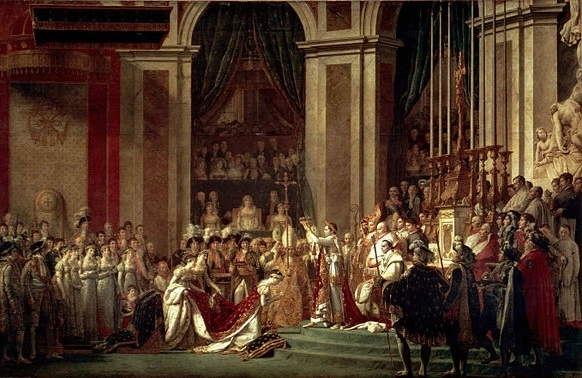 황제 대관식에서 조세핀에게 왕관을 씌워주는 나폴레옹, 위는 다비드의 그림, 아래는 영화 속 그 장면 (1804)