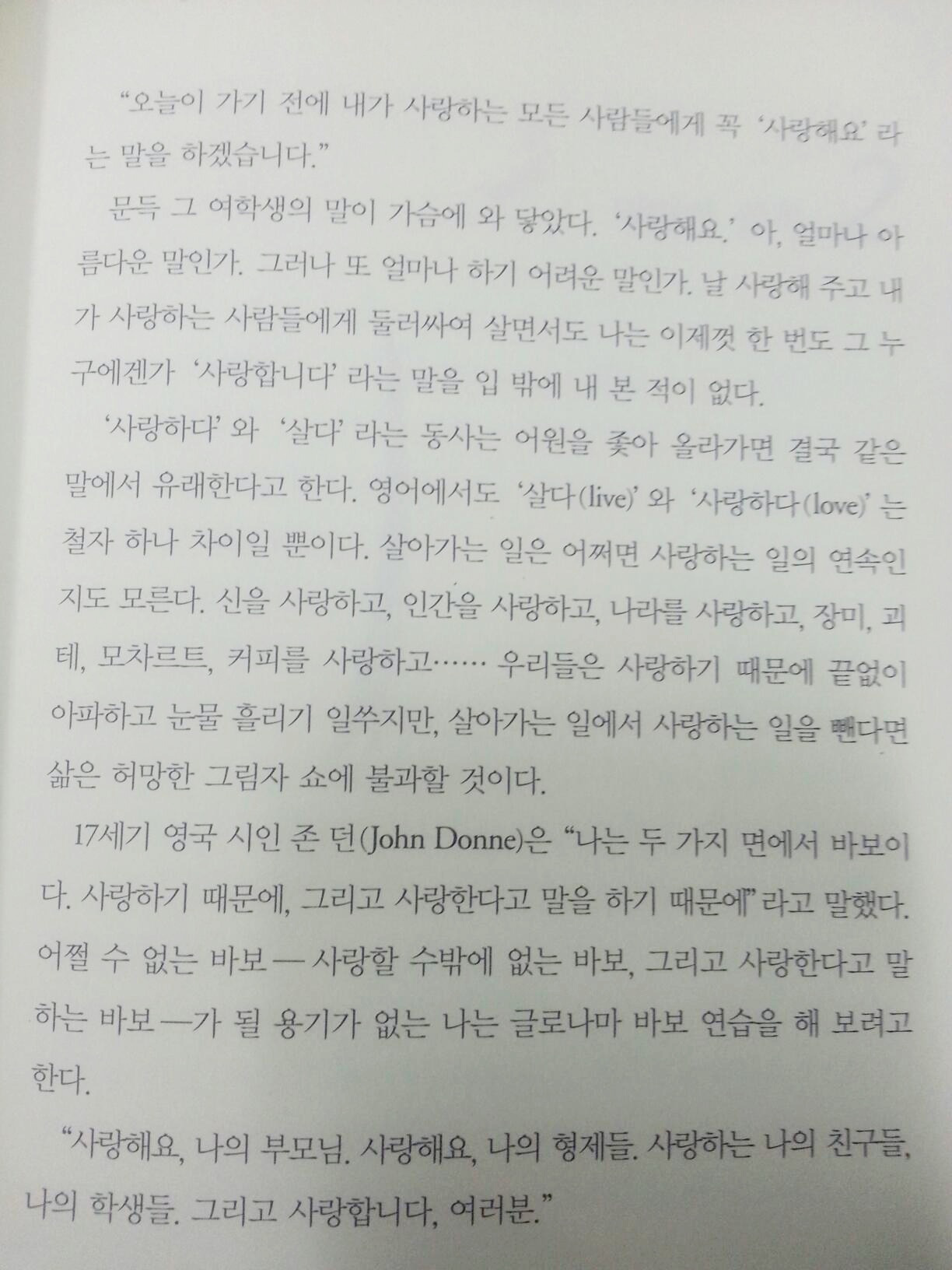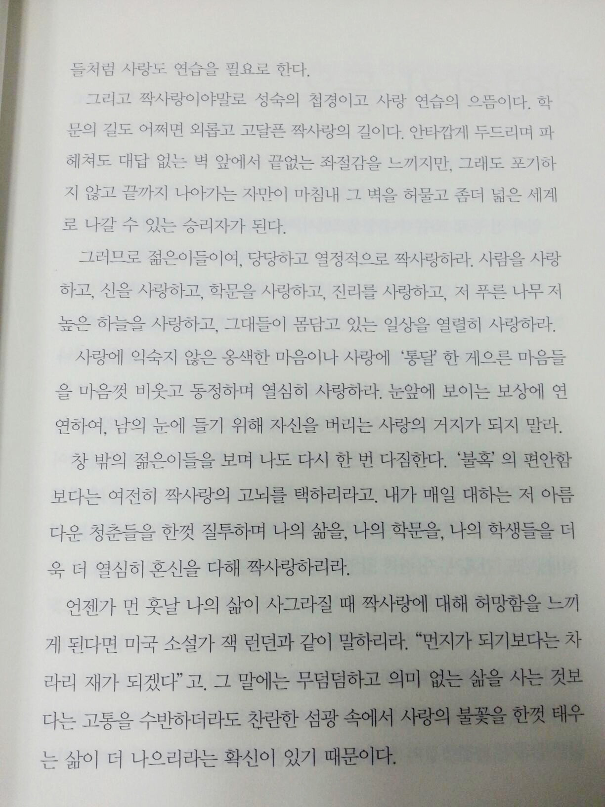 최근 이 책을 또 읽어보았습니다. 장영희 선생님의 희로애락이 들어있는 자전적인 수필.. 책 내용 중 사랑과 짝사랑에 눈이 더 가서 그 페이지를 찍어서 올립니다. "살아가는 일은 어쩌면 사랑하는 일의 연속인지도 모른다", "먼지가 되기보다는 차라리 재가 되겠다".. 때론 아프게 때론 불꽃같이 살다 간 선생님의 삶과 사랑에 대한 일성이 제 귀에 울리는 듯합니다. "너도 그렇게 살라"고..