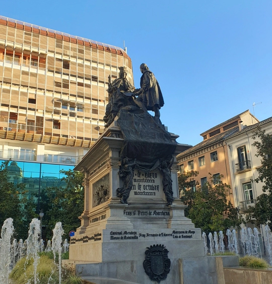 마드리드에 이어 스페인 제 2의 도시인 바르셀로나에도 콜럼버스 동상이 있습니다. 바르셀로나는 그가 1차 항해 후 돌아와서 그곳에 가있던 이사벨 여왕과 페르난도 왕에게 결과 보고를 한 도시이기에 그것을 기념해 그의 동상을 세웠습니다. 지중해의 항구 도시 발렌시아가 커지면서 제 3의 도시 자리를 내준 세비야의 대성당엔 그의 유언을 따른 독특한 묘지가 있다고 했습니다. 그 세비야 근처 고대 로마의 도시이자 이슬람 시절 실질적인 수도 역할을 한 코르도바에도 콜럼버스의 동상이 있습니다. 그가 이사벨 여왕과 페르난도 왕을 접견하는 3인의 동상입니다. 그리고 이사벨 여왕이 묻혀있는 그라나다에도 그의 동상이 있습니다. 성당 근처 이사벨 라 카톨릭 광장에 그 동상이 있습니다. 그녀가 투자를 결재하는, 소위 산타페 협약이라 불리는 모습을 재현한 동상입니다. 그렇게 그라나다엔 그녀의 무덤이 있고 근처에 콜럼버스와 함께 있는 동상도 있으니 그 둘은 죽어서도 개발자와 투자자로 영혼의 파트너가 된 듯합니다. 아메리카 신대륙 발견의 주역입니다.
