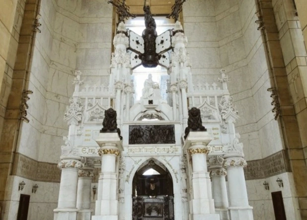 그의 묘지가 있는 세비야 대성당은 이슬람 왕국 시절 세워진 모스크를 리모델링한 고딕 양식의 성당으로 유럽에서 베드로 대성당과 웨스트민스터 사원에 이어 세 번째로 큰 성당입니다. 성당 둘레 4면을 다 돌아볼 수 있고 이슬람 양식인 중정까지 있어서인가 밖에서 볼 때 느껴지는 거대함은 그 두 성당 이상으로 커 보입니다. 내부 역시 넓은 공간에 많은 미술 작품과 금장식으로 화려함을 자랑하고 있습니다. 그런 유명세로도 전 세계에서 많은 관광객이 찾아오는 그 성당 안 가장 잘 보이는 곳에 콜럼버스의 묘지가 있습니다. 잘 보일 수밖에 없는 것이 그의 묘지는 바닥이나 지하에 있지 않고 공중에 떠있기 때문입니다. 스페인 땅에 묻히길 원치 않은 그의 유언을 존중해 그렇게 떠있는 무덤으로 조성한 것입니다.