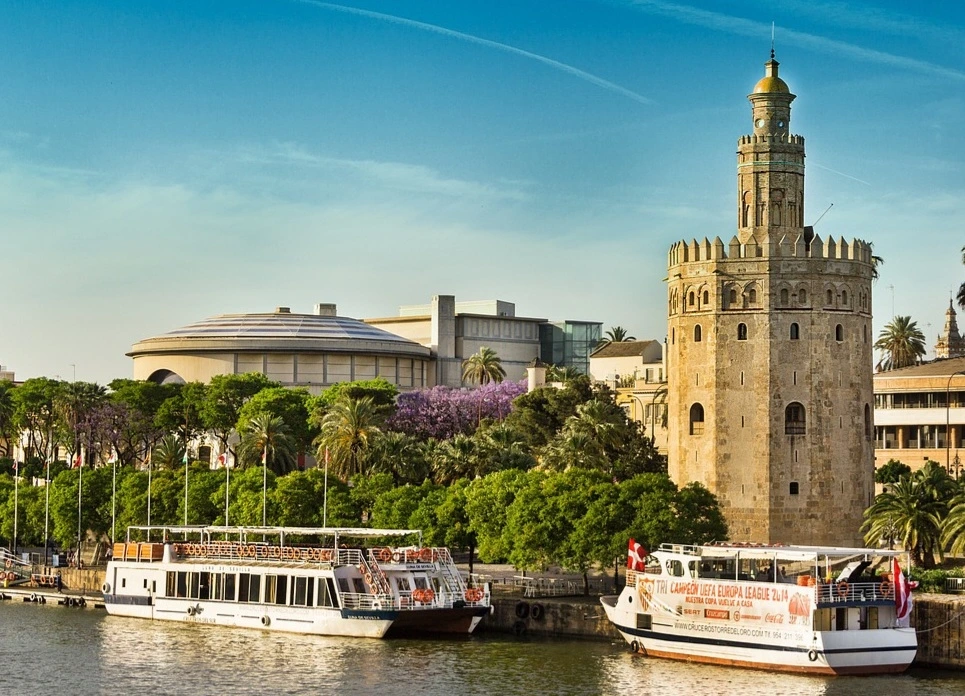 세비야의 과달키비르 강변에 위치한 음악당인 마에스트란사 극장. 우측은 황금의 탑 (출처, pixabay)