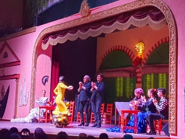 세비야의 플라멩코 전용 극장에서의 플라멩코 공연 모습. 댄서, 가수, 기타 연주자로 구성됨