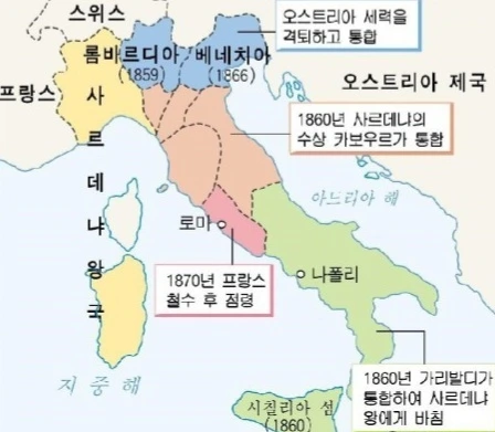 19세기 중반 이탈리아 통일 운동의 지형. 북부에 오스트리아의 구성국인 롬바르디아-베네치아 왕국 존재 (출처, 두피디아)