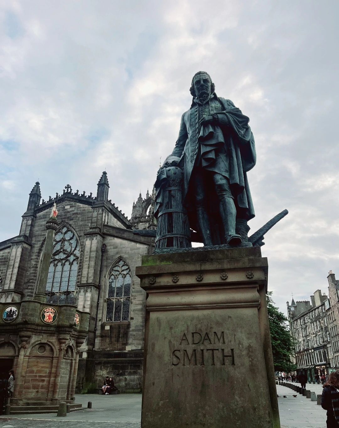 이제 언덕 위 에든버러성을 향해 올라갑니다. 로열마일(Royal Mile)이라 불리는 길입니다. 우리로 치면 조선 시대 광화문 앞 육조거리와 같은 곳입니다. 길 양쪽으로 고색창연한 관공서와 교회, 그리고 각종 상점과 주택들이 줄지어 서있습니다. 모두 스코틀랜드의 역사가 서린 건물들일 것입니다. 상점 중엔 스코틀랜드의 특산품인 캐시미어 숍이 가장 많이 보였습니다. 스코틀랜드 출신의 유명한 철학자인 데이비드 흄과 경제학자인 아담 스미스의 동상도 만나게 됩니다. 사람들에겐 존경의 대상이지만 비둘기들에겐 그저 화장실로 사용되는 그들의 동상입니다. 물론 백파이프 연주와 켈트족의 민요 버스킹도 계속해서 들렸습니다.