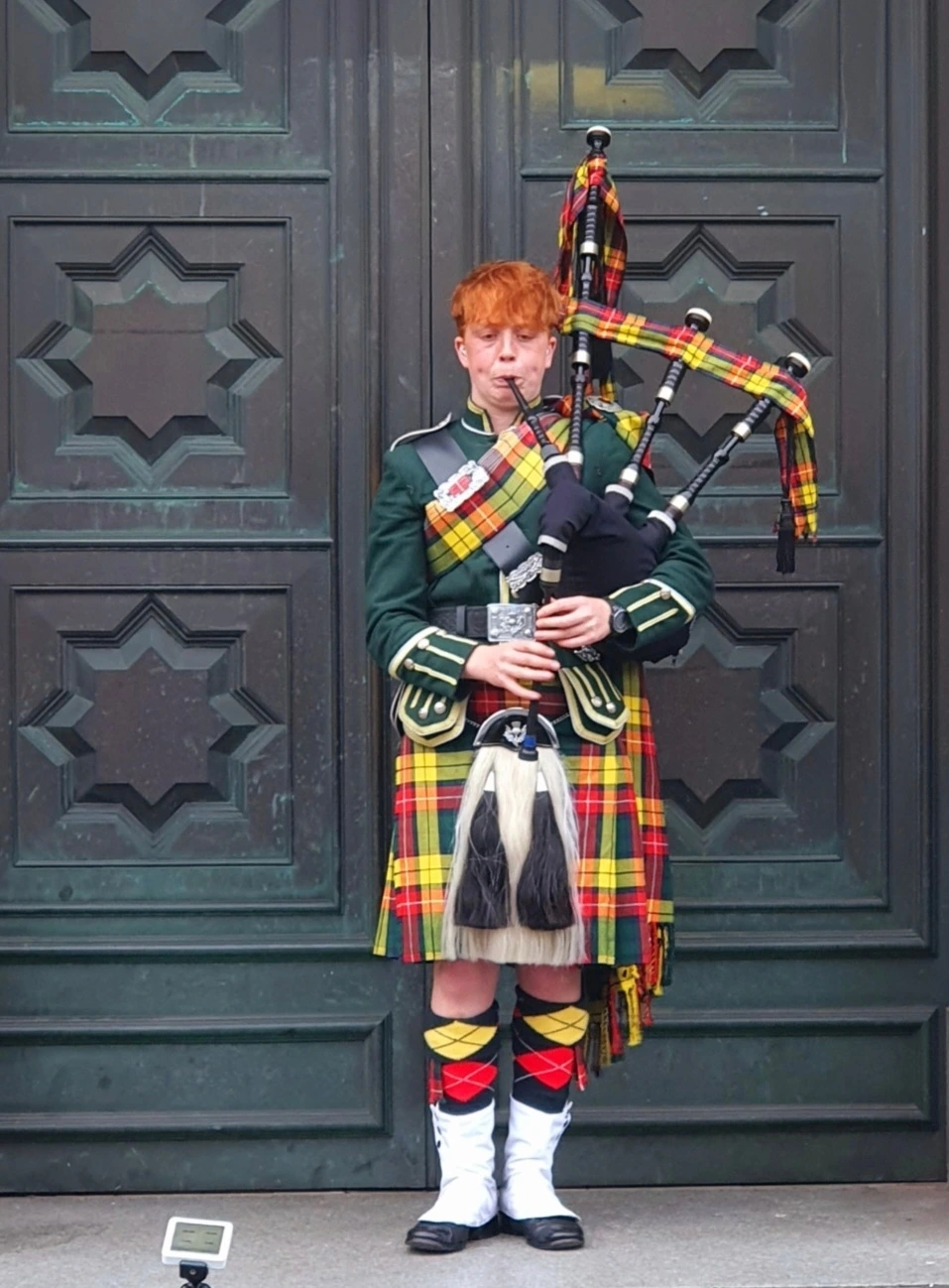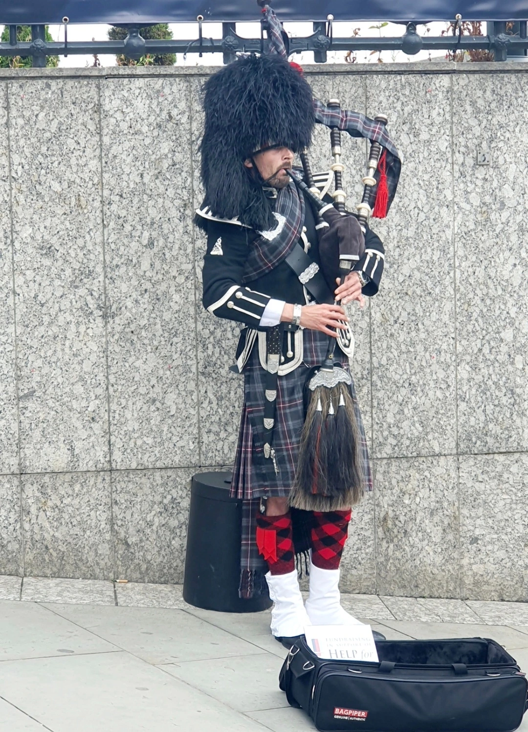 그리고 서편 멀리에도 높은 언덕이 보이는데 칼턴힐(Calton Hill)이라 불리는 곳입니다. 그곳에도 넬슨의 기념비가 있습니다. 그는 잉글리시맨이지만 스코틀랜드와 통합된 영국을 프랑스의 나폴레옹으로부터 구한 영웅이니 한편으론 스코틀랜드의 영웅이기도 합니다. 그 기념비는 런던 트라팔가 광장의 그것처럼 원통형으로 올라가지만 지름은 훨씬 굵습니다. 통이 큰 스코츠맨의 영향력이 작용했나 봅니다. 칼턴힐은 에든버러에서 구시가지와 신시가지 모두를 조망할 수 있는 최고의 비스타 포인트입니다. 멀리 북해 바다까지 보이니까요. 역 지상 광장에 오르자마자 들렸던 구슬픈 백파이프 소리는 그 광장 끝 버스킹 연주자의 연주였습니다. 그 소리는 이후 에든버러 어디를 가도 듣게 됩니다. 연주자는 모두 남자임에도 여기가 스코틀랜드임을 보여주는 타탄 체크의 킬트 치마를 입고 있었습니다.