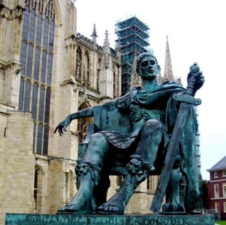 330년 그의 이름을 딴 콘스탄티노플로 제국의 수도를 천도한 콘스탄티누스 1세도 황제 즉위 전엔 요크에서 아버지를 도와 스코틀랜드의 정복 사업을 진행 중에 있었습니다. 그 시대 오늘날 영국의 요크에서 튀르키예의 이스탄불까지 오갔던 콘스탄티누스, 정말 대단한 스케일의 로마 제국이었습니다. 마찬가지로 그 300년 전인 하드리아누스 황제도 스코틀랜드 국경선에 세운 하드리아누스 방벽과 같은 그의 건축물을 튀르키예의 안탈리아에 세웠습니다. 지금도 건재한 하드리아누스의 문입니다. 콘스탄티누스는 요크에서 아버지가 죽자 선왕을 계승해 서방정제로서 황제까지 오른 것입니다. 그 전임 디오클레티아누스 황제 때 로마는 넓은 제국을 효율적으로 다스리기 위해 제국을 동방과 서방으로 나누고 각각 정제와 부제, 4명이 다스리는 체제로 바꾸었습니다. 그들 중 최고 실력자가 황제가 된 것입니다. 콘스탄티누스는 그가 있던 브리타니아의 요크에서 황제 즉위식을 올렸습니다. 요크 민스터라 불리는 대성당 마당에 그의 동상이 서있습니다. 아니 황제라서인가 앉아있습니다.