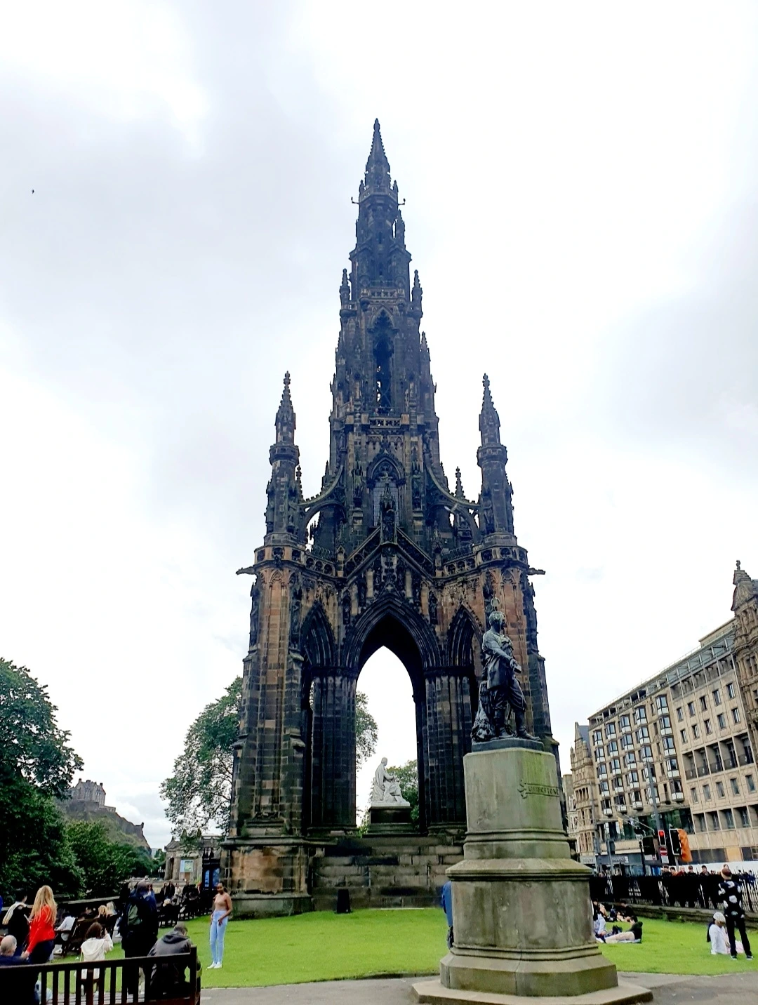역 광장엔 스코틀랜드의 대문호인 월터 스콧의 동상이 런던의 트라팔가 광장의 넬슨 동상처럼 높게 서있습니다. 누구든 스코틀랜드 도착 후 처음 만나게 되는 스코츠(Scots)인 스콧(Scott)입니다. 하지만 원통형 일자로 올라가 단조로운 넬슨의 탑과는 달리 월터 스콧의 탑은 다이내믹한 고딕 양식으로 세워졌고 크기도 넬슨의 탑을 압도합니다. 1843년에 세워진 넬슨의 탑보다 41년 늦게 세워져 모든 면에서 잉글랜드를 이기기 위해 그렇게 만들었다고 합니다. 그래서 검은 그 탑은 마치 그의 소설 <아이반호>에 나오는 흑기사처럼 위압감을 줍니다. 월터 스콧은 기념비 꼭대기에 서있는 넬슨과는 달리 기념비 중앙에 우아하게 앉아있습니다. 그 앞엔 아프리카 탐험가이자 선교사인 리빙스턴의 동상이 서있습니다. 당연히 그도 스코츠맨입니다.
