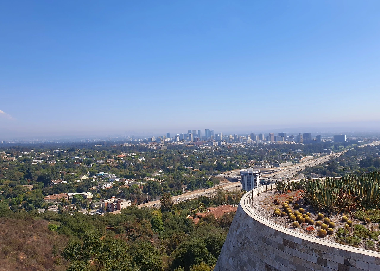 다섯 개 동 중 어느 갤러리를 먼저 들어가도 상관이 없지만 그 미술관엔 먼저 보면 좋을 대작이 하나 있습니다. 갤러리들 사이의 중앙 통로로 직진해서 나가면 나타나는 전망대와도 같은 테라스에서 보이는 정경입니다. LA의 드넓고 시원한 전경이 눈앞에 펼쳐집니다. 직선 방향으로 가까이로는 UCLA 캠퍼스가 보이고 멀리는 다운타운이 보입니다. 항구가 있는 롱비치도 보입니다. 왼쪽으론 할리우드와 비버리힐스가 숨어있고 오른쪽으론 말리부와 산타모니카가 보입니다. 미술관에 왔지만 LA 최고의 전망대에 온 것입니다. 미술관 바로 아래엔 산을 타고 센트럴 가든과 캑터스 가든이 놓여 있습니다. 물론 그 정원도 건축물의 일부입니다.