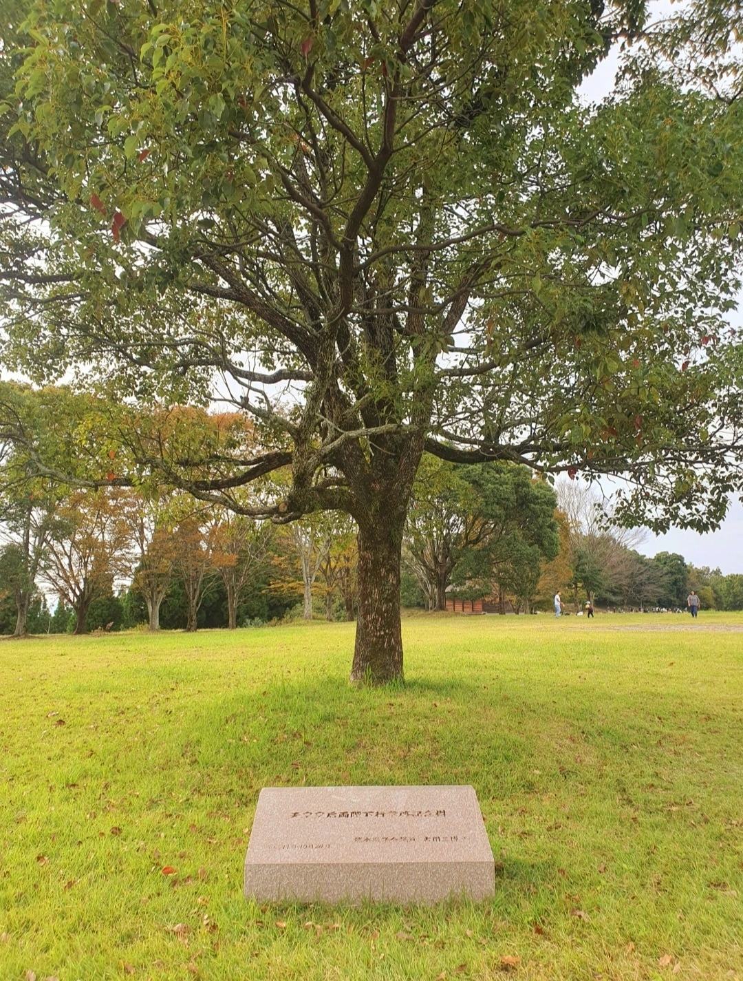 1999년 기쿠치성을 방문한 아키히토 천황이 식수한 나무