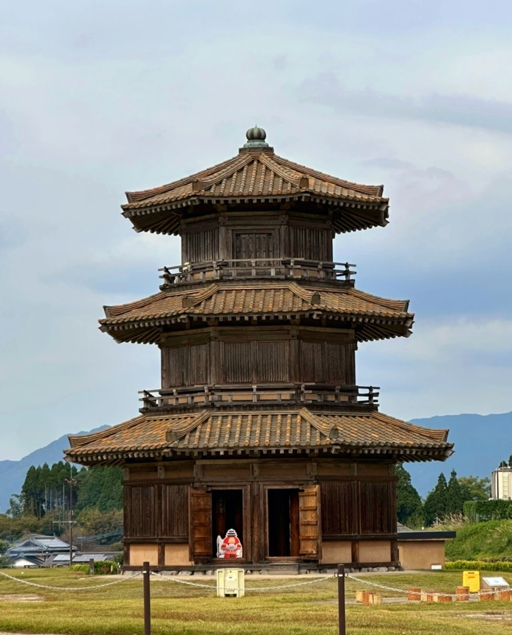 기쿠치 성터에 조성된 백제 스타일의 8각형 고루(鼔樓). 적 침입 시 북으로 상황을 알렸던 곳.