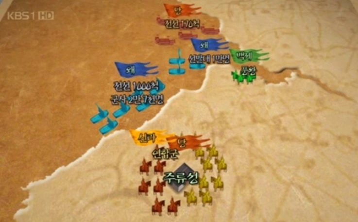 백제-일본, 신라-당나라가 연합하여 4개국이 벌인 백강구 전투 고증도 (출처, KBS TV '역사저널')