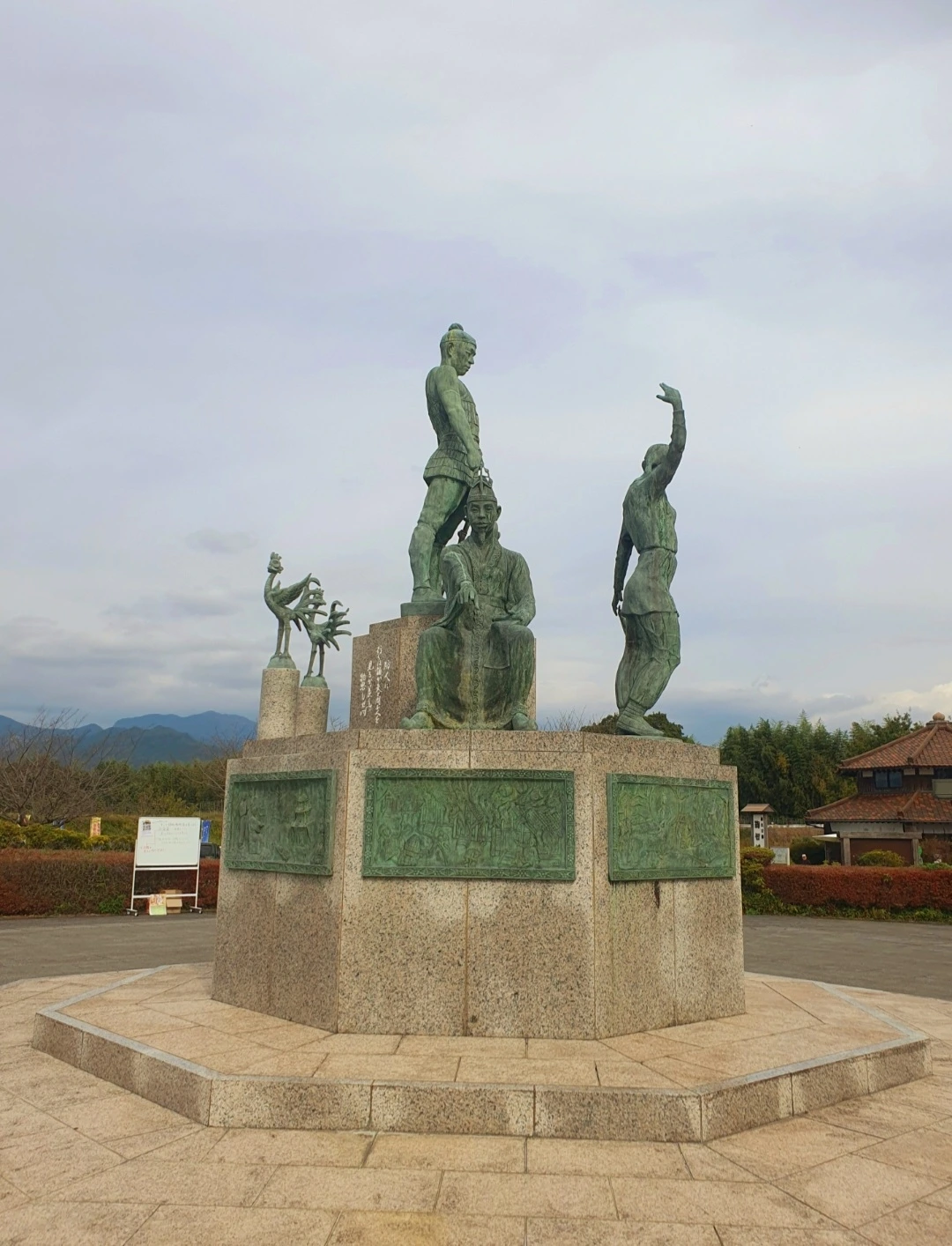 기쿠치 성터에 조성된 동상들. 중앙에 앉아서 건축을 감독하는 이가 백제의 유민