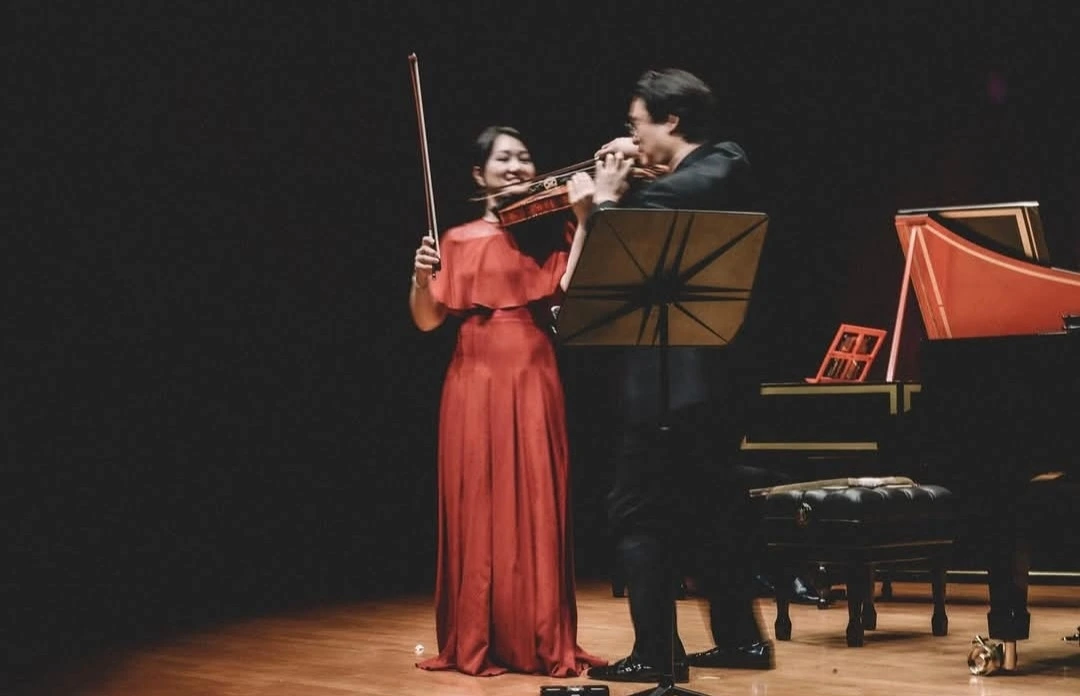 조명 아래 빨간 라인이 들어간 예쁜 쳄발로가 놓여 있고 그 옆에 비올라가 있습니다. 그런데 한 대의 비올라를 가지고 두 명의 남녀 연주자가 각자의 활을 가지고 샴쌍둥이처럼 붙어서 연주를 합니다. 둘이서 피아노 연탄 연주를 하듯이 비올라 한 대를 공유하며 듀엣 연주를 하는 것입니다. 구조상 반대로 활질을 할 수밖에 없습니다. 여자 비올리스트는 엉거주춤한 자세로 그녀의 움직임을 따라다니며 힘겹게 연주하는 남자 비올리스트의 모습이 웃기는지 참지 못하고 연주 중 웃음을 토해냅니다. 그들은 그렇게 연주하며 무대를 가로질러 무대 뒤로 사라졌습니다. 그래도 무대 뒤에서도 연주는 멈추지 않고 계속 이어집니다. 그들이 문을 빼꼼 열고 장난스레 관객석을 향해 손을 흔들며 바이바이를 할 때까지 말입니다.
