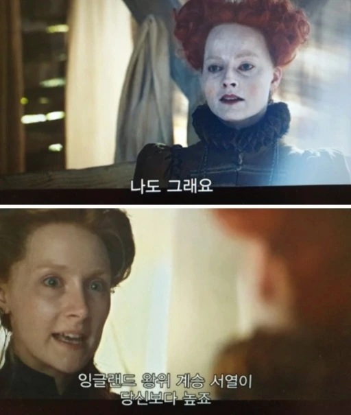 제목처럼 영화는 스코틀랜드의 여왕인 메리가 주인공으로 나옵니다. 하지만 잉글랜드의 엘리자베스 여왕도 주인공급으로 나옵니다. 그녀는 1952년 동명의 엘리자베스가 26세에 여왕으로 즉위하면서 엘리자베스 여왕에서 엘리자베스 1세 여왕으로 정식 호칭이 바뀌었습니다. 1세 엘리자베스는 생전에 2세보다 1년 먼저인 25세에 여왕으로 즉위했습니다. 영화는 메리 시점에서 만들어졌기에 메리는 주연인 프로타고니스트이고 엘리자베스는 적대자인 안타고니스트로 나옵니다. 그렇게 둘은 라이벌 관계를 형성하며 같은 목표를 이루기 위해 그녀들만의 정치를 했습니다. 서로가 갖고 있는 것을 뺏고자 함이었습니다.