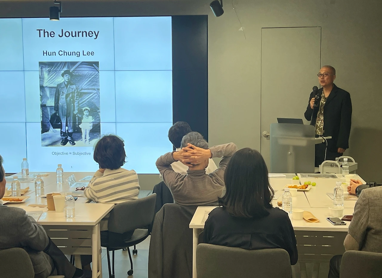 강연에 앞서 도예가라고 제가 그를 소개했는데 그는 도예가가 아닌 듯했습니다. 아래 사진, 그의 강의 첫 화면에 뜬 앙증맞은 그의 어린 딸의 손에 쥐어진 조그만 도자기가 보인 후 슬라이드가 계속해서 넘어가도 도자기는 나오지 않았으니까요. 대신 회화, 디자인, 조각, 건축, 설치, 무빙, 미디어, 컴퓨터, 자연.. 이런 요소들이 결합된 그의 작품들이 줄줄이 나왔습니다. 그의 편안하되 심도 있는 설명과 함께 말입니다. 사진 위 'The Journey'라는 타이틀은 그의 일생의 작업 주제입니다. 그가 쓰는 근육으로 만들어진 모든 작품은 그런 저니라는 사유와 경험을 통해서 만들어진 것으로 보입니다. 그가 올린 첫 화면은 30년 전에 찍은 사진으로 그의 두 번째 전시회 출정식을 이렇게 딸과 함께 찍은 흑백 사진으로 포스터에 담았다고 했습니다. 과거의 사진이지만 모던을 넘어 포스트모던해 보이는 그입니다.