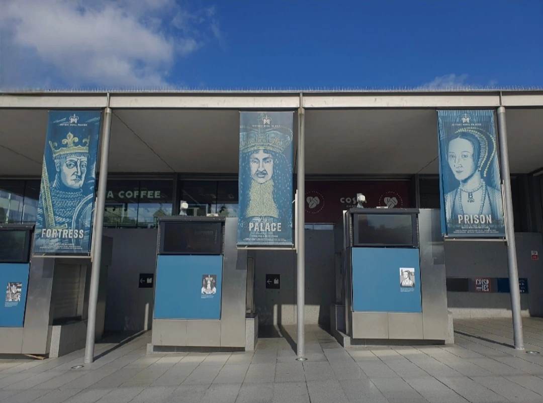 런던타워 앞엔 그 타워의 용도를 알려주는 파란 부스가 있습니다. 한때 매표소로 사용된 곳처럼 보이는 곳입니다. 위의 사진에서 보듯이 런던타워는 요새, 왕궁, 감옥이라고 안내되어 있습니다. 타워이지만 탑이나 전망대라는 안내문은 보이지 않습니다. 그리고 그곳에 런던타워를 용도별로 대표하는 인물들이 그려져 있습니다. 런던타워의 파운더인 정복왕 윌리엄 1세와 그곳에서 처형당한 앤 볼린의 모습이 양 끝으로 보입니다. 가운데 장발의 왕은 찰스 2세입니다. 그의 재위 때까지 잉글랜드 국왕의 대관식엔 런던타워에서 웨스트민스터 사원까지 행진하는 관례가 있었습니다. 그래서 그를 왕궁을 상징하는 인물로 내세운 듯합니다.
