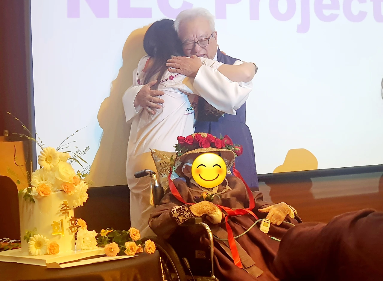 그리고 스피치를 통해 그들 남매를 정성으로 키워준 부모의 은혜에 감사하다고 했고, 특히 아버지에게는 지금까지 엄마를 사랑해주셔서 고맙다는 감사 인사를 드렸습니다. 60년을 함께 산 남편에게 말을 할 수 없는 엄마의 마음을 대변해서 한 것입니다. 물론 아버지도 아내와 딸에게 감사 인사를 전하고 포옹을 나눴습니다. 병마로 인해 표현을 못 하는 그녀의 의식과 인지 상태는 정확히 알 수 없지만, 아내와 엄마로서 남편과 딸이 그렇게 차려준 축복스러운 회혼식 정경은 그녀에게 전달되고 입력되었을 것입니다.