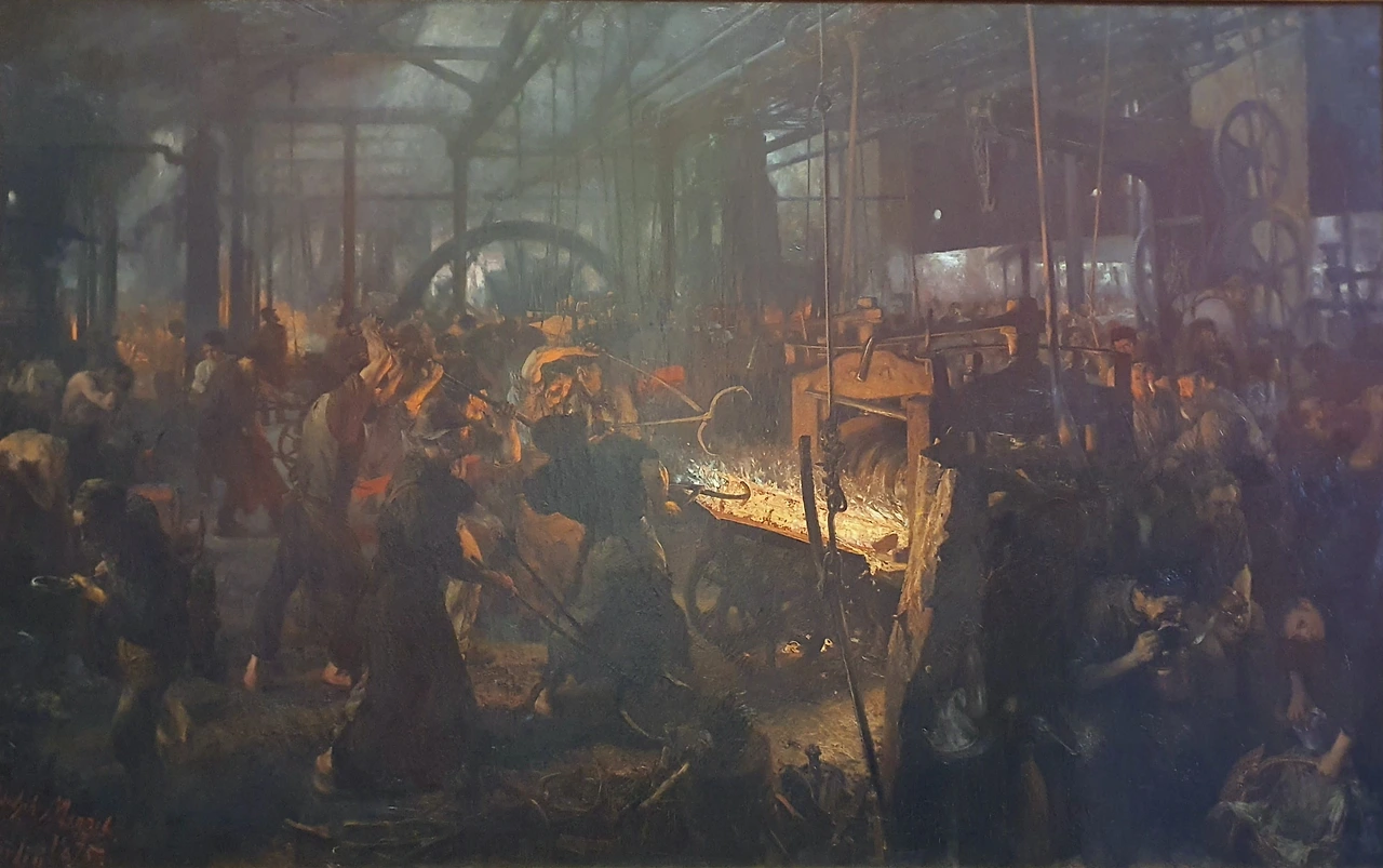 그 그림 맞은편엔 독일제국 시절 하층민인 도시 노동자의 삶을 묘사한 아돌프 멘첼의 다른 그림이 걸려 있습니다. 시차는 있지만 한 시대의 최상과 최하를 묘사한 그림이 서로 마주 보고 있는 것입니다. 농업에서 공업화로 가고 있는 독일의 모습도 함께 보이는 작품으로 <제철공장>이란 그림입니다. 그림에선 마치 용광로와 사투를 벌이는 듯한 노동자들의 모습이 보여집니다. 그 난리판에서도 오른편 하단의 노동자는 허겁지겁 밥을 먹고 있습니다. 식사 시간이 주어지지 않는 작업 환경이었을 것입니다.