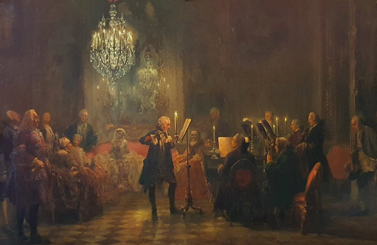 <상수시 궁전에서 플루트를 연주하는 프리드리히대왕>입니다. 독일의 사실주의를 대표하는 화가 아돌프 멘첼의 작품입니다. 프리드리히 대왕은 그가 건축한 상수시 궁전에 사람들을 초대해 그들 앞에서 직접 플루트를 연주할 정도로 예술에도 조예가 깊은 군주였습니다. 그림에선 당시 독일의 풍요로운 상류사회의 모습이 보여집니다. 플루트 솔로에 맞춰 반주를 하고 있는 악단의 피아니스트는 음악의 아버지인 바흐의 아들로 알려져 있습니다. 이전 시대이므로 상상으로 그린 역사화입니다.