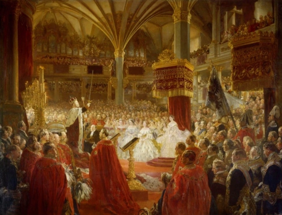 아래 두 그림은 같은 인물인 빌헬름 1세의 1861년 프로이센 7대 국왕 취임식과, 1871년 독일제국 초대 황제 취임식을 그린 그림입니다.