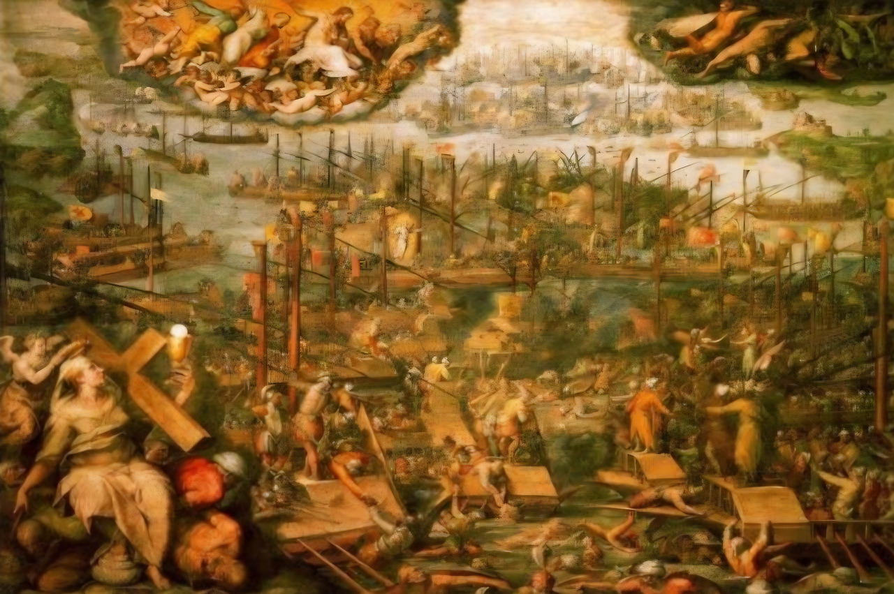 1571년 같은 해 10월 7일 유럽의 기독교도들에겐 역사에 길이 남을 승전보가 전해집니다. 그리스 앞바다에서 벌어진 레판토해전의 승리입니다. 스페인의 펠리페 2세와 그의 4촌인 신성로마제국의 막시밀리안 2세가 합작해 서쪽 유럽을 넘보는 오스만제국을 궤멸시킨 것입니다. 기독교가 이슬람교에게 시원하게 승리를 하였습니다. 신성동맹을 결성했던 교황 비오 5세는 너무나도 기뻐해 그 승리엔 성모 마리아의 도움이 있었다며 10월 7일 그날은 지금도 승리의 성모축일로 기리고 있습니다. 르네상스기 <미술가 열전>을 저술한 조르조 바사리는 성모 마리아가 등장하는 그 해전을 그림으로 기록했습니다. 현재 그 그림은 바티칸 교황청의 접견실에 걸려있습니다.