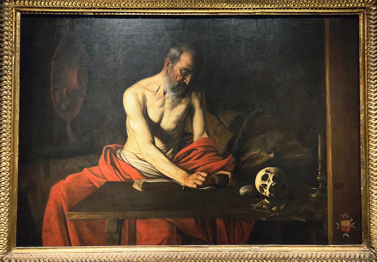 이 그림 외에도 카라바조는 그 성당에 작품을 하나 더 남겼는데 그 작품은 주인공이 세례 요한이 아니라서인가 위의 그림만큼 대우는 받지 못하고 있습니다. 독방이 아니고 그냥 벽에 걸려있는 그림입니다. 어려운 히브리어 성경의 원문을 라틴어로 번역해 성경 대중화에 기여한 제로니모를 묘사한 <성 제로니모의 필사>입니다. 역시나 카라바조의 상징성과 사실성이 드러난 작품으로 그림 속 제로니모는 구도자와도 같은 엄숙함으로 하느님의 신성한 작업을 수행하고 있습니다. 그 앞에 있는 해골은 죽음마저도 해탈한 그의 경지를 보여주고 있습니다. 베들레헴 근처 동굴 수도원에서 30년간 성경 번역과 수행에만 매달린 그였습니다. 그 작품을 보면서 만약 이 그림이 포르투갈 리스본에 있는 제로니모 수도원에 있다면 그곳에선 <참수당하는 성 세례 요한> 이상으로 독방에서 VIP 대우를 받을 텐데라는 생각이 들었습니다.