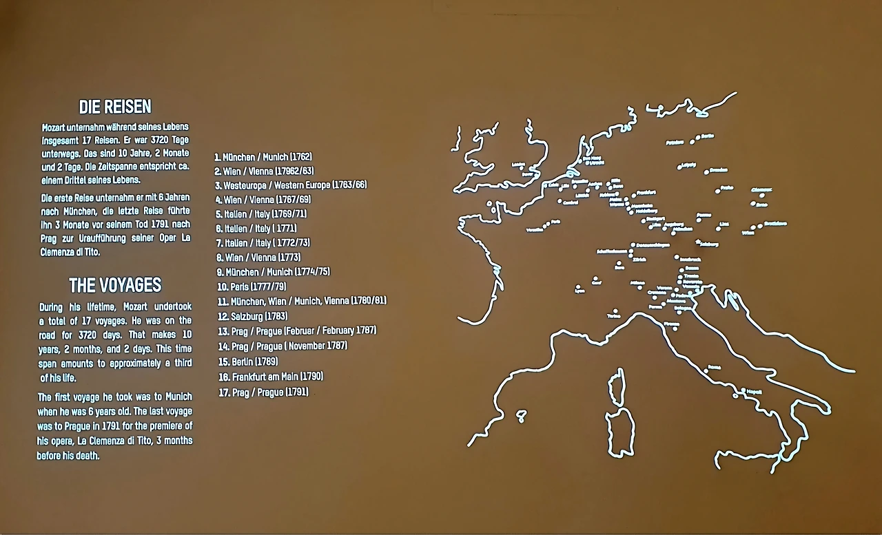 모차르트는 6살부터 연주 여행을 떠났습니다. 첫 여행부터 해외 공연이었습니다. 그의 고향 잘츠부르크에서 멀지 않은 뮌헨이었습니다. 그것을 시작으로 그는 평생 17번의 연주 여행을 하며 죽기 3개월 전인 프라하에서 짧지만 굵은 대장정을 마쳤습니다. 그의 35년 인생 중 1/3에 해당하는 10년 2개월에 해당하는 시간이었습니다. 아래 여행 지도는 잘츠부르크 모차르트 생가에 조성된 박물관 내 전시물입니다.