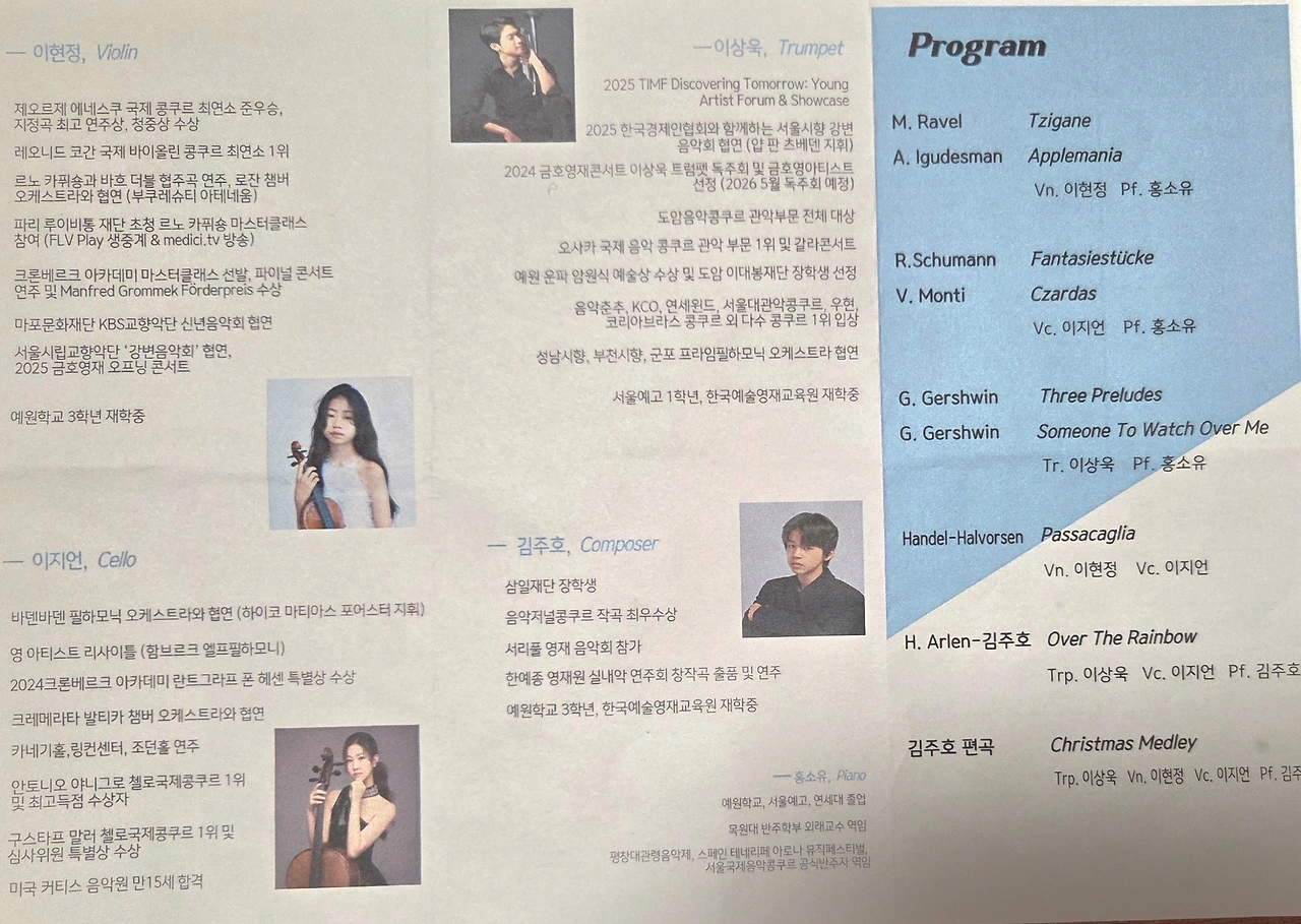 어제 음악회의 부제는 영재 음악회였습니다. 10대 중반에 불과한 나이이지만 그들의 음악적 물리적인 기량은 이미 다 올라왔을 것입니다. 이후엔 레퍼토리를 늘려가고 성숙미, 완숙미와 자기 색깔을 입히는 단계로 진행될 것입니다. 그들에게 감탄하며 행복한 감상을 했지만 아울러 뜨거운 응원의 박수를 보냅니다. 요즘 K 클래식이 뜨고 있는데 그들 중 훗날 천재란 찬사를 받는 세계적인 연주자도 나오길 기대합니다. 그래봤자 몇 년 안 남았습니다. 임윤찬 피아니스트가 반클라이반 콩쿠르에서 우승해 때의 나이가 18세였으니까요.
