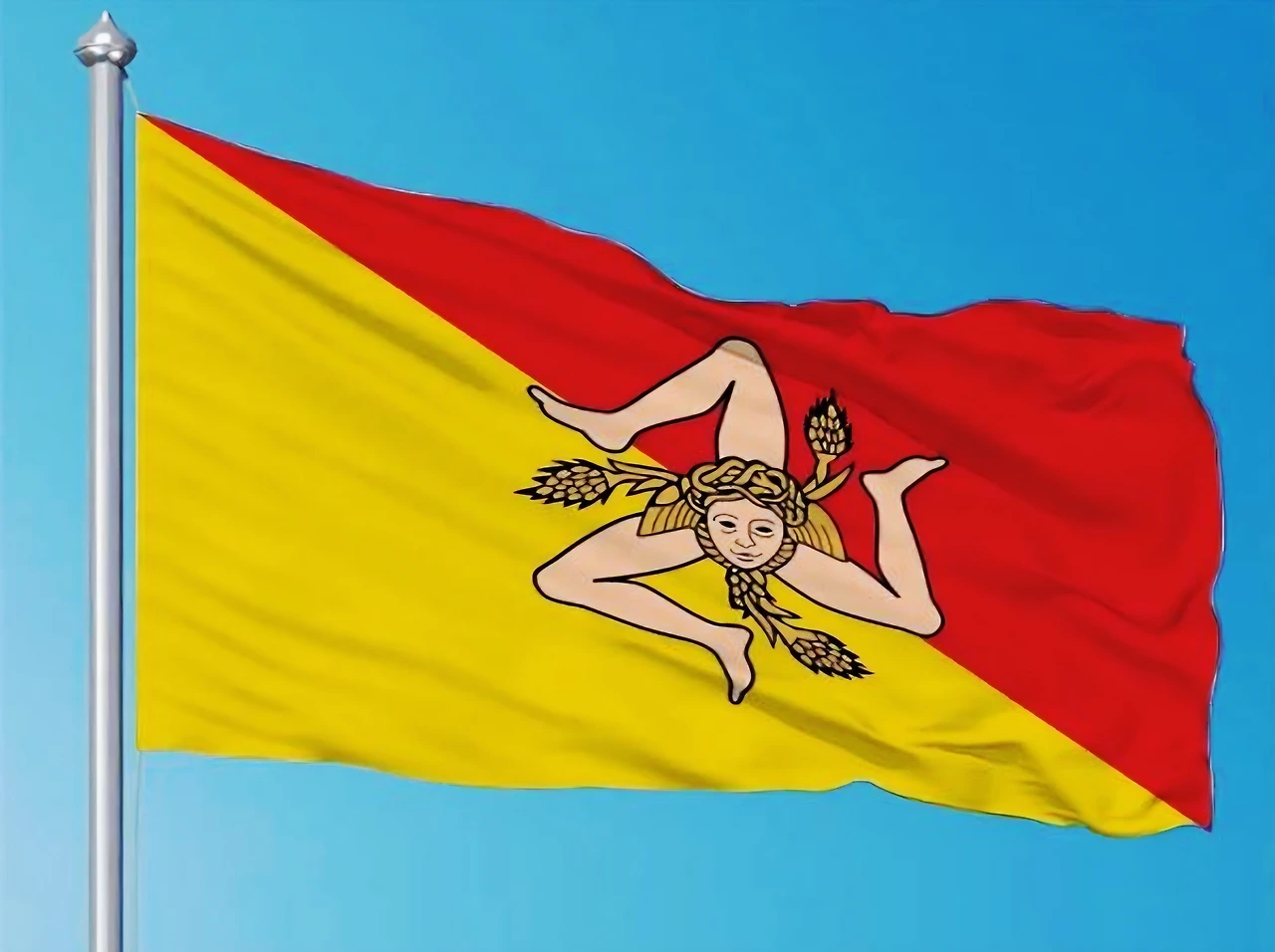 시칠리아 기는 오묘하고 그로테스크하기까지 합니다. 여신이 들어가 있는 것도 특이한데 괴물인 메두사가 들어가 있기 때문입니다. 그녀의 머리카락이 변한 뱀도 들어가 있습니다. 풍요로운 땅을 상징하는 밀이삭도 있고, 시칠리아 모양의 삼각형을 드러내는 3개의 발도 달려있습니다. 지중해 중앙 지정학적 위치로 워낙 침략이 많았던 지역이라 메두사를 넣었을 것입니다. 쳐다만 봐도 꽁꽁 굳어버리니 아예 쳐다볼 생각도 말라고 말입니다. 트리나크리아(Trinacria)라 부릅니다.