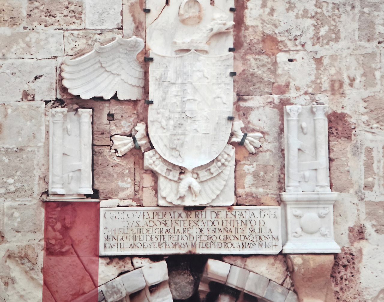 그 표식은 신성로마제국과 스페인왕국의 국가 문장이 결합된 모양입니다. 오늘날 스페인 국기에도 상당 부분 들어가 있는 그 문양이 마니아체성 안 궁전 문 위에 새겨져 있었습니다. 안내문의 내용을 보니 합스부르크왕가와의 결혼으로 스페인 역사상 최고로 넓은 영토를 자랑했던 신성로마제국의 카를 5세(스페인에선 카를로스 1세) 때인 1545년 그 돌판 문양이 붙여진 것으로 쓰여 있었습니다. 시라쿠사, 아니 나아가 시칠리아가 스페인 & 신성로마제국 & 합스부르크왕가의 영토임을 분명히 한 것입니다.