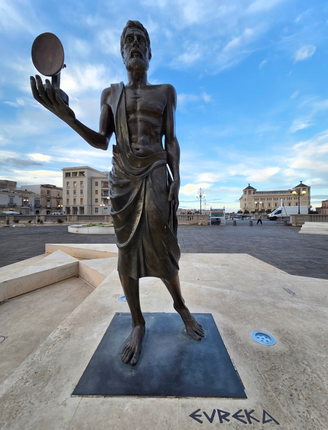 시칠리아의 시라쿠사는 기원전 8세기 고대 그리스 때부터 번성했던 고도 중의 고도입니다. 에게해와 이오니아해 사이에서 헬라스를 표방하며 한통속으로 살았던 그리스인들은 어느 순간부터 대그리스주의(Magna Graecia)를 표방하며 적극적으로 식민지 건설에 뛰어들었습니다. 시칠리아는 그 시대에 그리스인들이 입도한 것이었습니다. 시라쿠사를 유명하게 만든 유레카의 저작권자 아르키메데스는 기원전 3세기에 그 도시에 살았습니다. 그리스 끝물입니다. 그리스는 최종적으로 기원전 142년에 로마에 의해 멸망했으니까요. 시라쿠사는 과연 아르키메데스의 도시답게 조그만 다리로 연결된 구시가지인 오르티지아섬 입구에 그의 동상을 세웠습니다. 지금도 유레카를 외치고 있는지 그가 외친 'EUREKA'도 바닥에 그림자처럼 박제되어 있습니다.