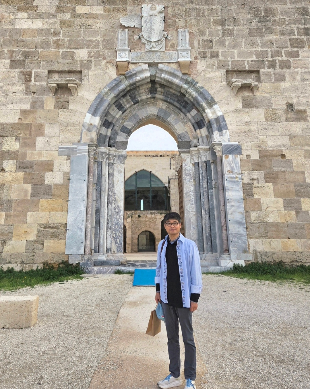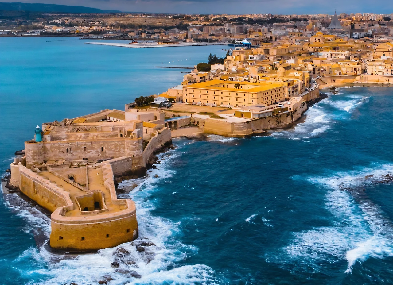 2천5백 년 전 인물인 아르키메데스의 동상이 오르티지아섬 입구에 있다면 그 반대 바다 쪽 끝엔 시라쿠사를 지키는 성채가 서있습니다. 배의 이물처럼 뾰족한 이등변 삼각형 모양의 마니아체성(Castello Maniace)입니다. 과연 아르키메데스의 도시답게 성 모양도 기하학적으로 독특하고 아름답게 생겼습니다. 독일계인 호엔슈타우펜가문인 신성로마제국의 프리드리히 2세(1194~1250) 때 지어진 성입니다.