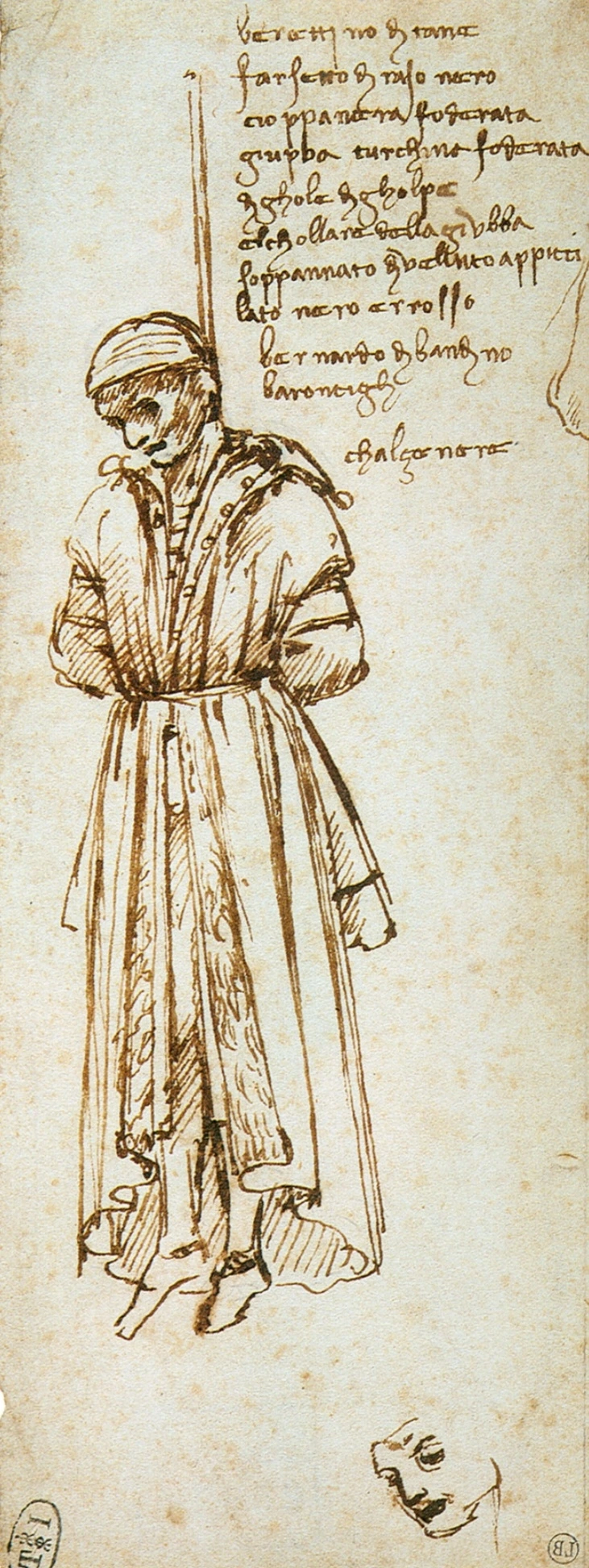 광장을 가득 채운 시민들은 그 스펙터클한 처형 장면을 구경하느라 모두 고개를 빼고 위를 쳐다보았습니다. 죄인을 가두던 바르젤로궁 외벽 창문 밖으로 밧줄에 목이 메어 덜커덕 떨어져 신체가 늘어지는 교수형을 구경하기 위함이었습니다. 죄수의 이름은 바론첼리로 그는 1453년 동로마제국이 무너지며 오스만제국으로 변한 콘스탄티노플에서 왔기에 복장이 특이했습니다. 그래서 군중 속에 섞여있던 어떤 화가는 빠르게 그 처형 장면을 스케치했습니다. 그리고 친절하게 그림 속에 그 의상에 대한 설명까지 달았습니다. 레오나르도 다빈치였습니다.